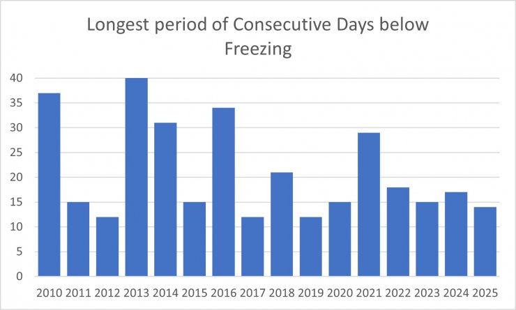 Since about 2016 there has been a decrease in the length of these subzero periods. Since then the longest period has been 29 days from the 17th of January to the 14th of February. Interestingly the joint second longest period of sub zero midday temperatures since 2016 also occurred in the 2020/21 season from the 20th of December to the 9th of January.