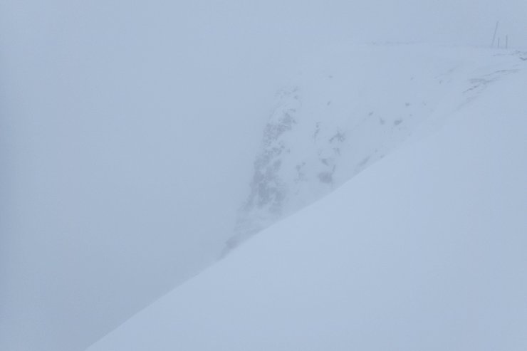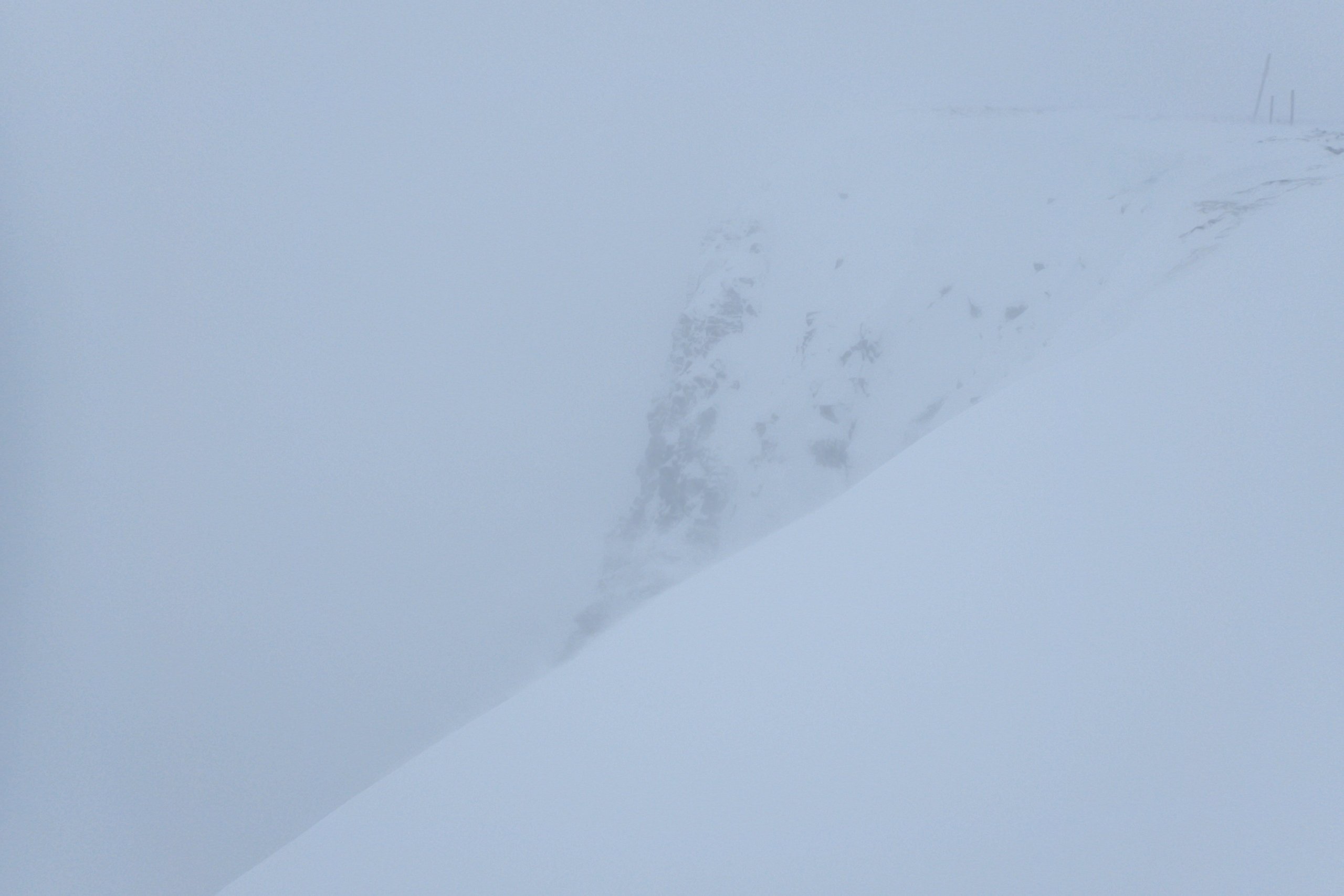 Visibility was poor this morning so not the best of photos of the crags of Coire an Lochan. In general significantly more snow about, and some fresh weak looking cornices.