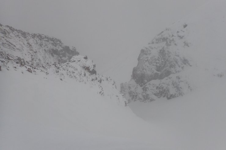Looking up the Goose Gully this morning. At this time there was a dusting of snow above about 1000 metres. During the day the snow level crept down the hill as it gradually got colder and snow showers got blown through.