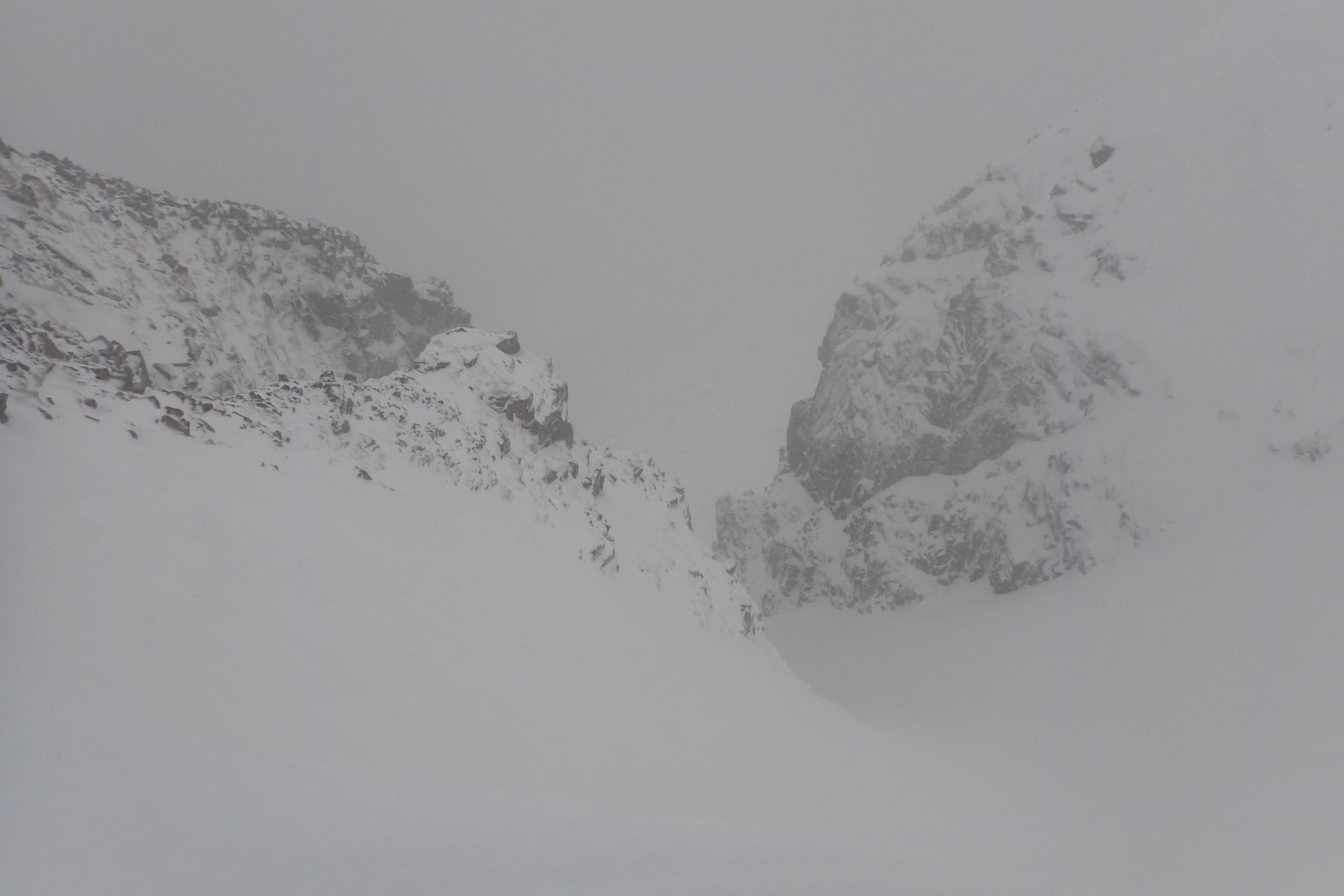 The view down Easy Gully. Although looking as it if is holding a lot of fresh snow, in reality it is only a thin layer of fresh snow sitting on the old wet snowpack.