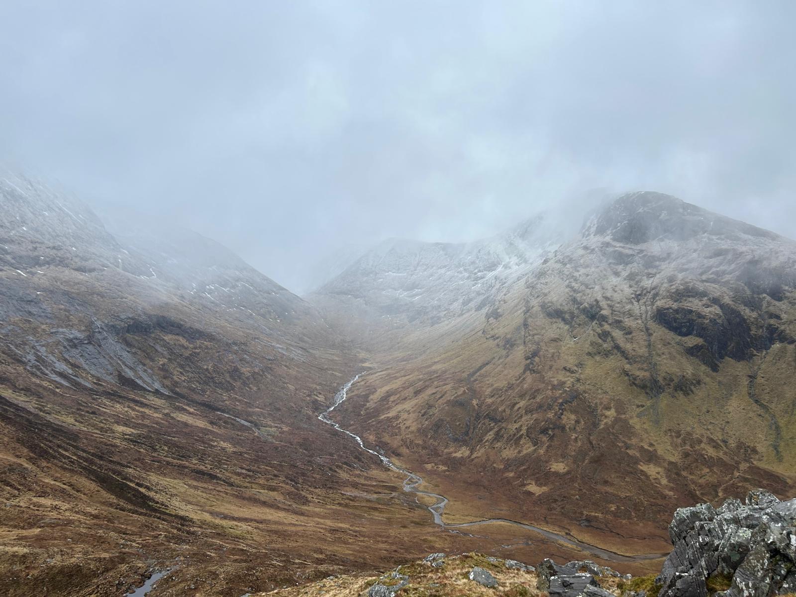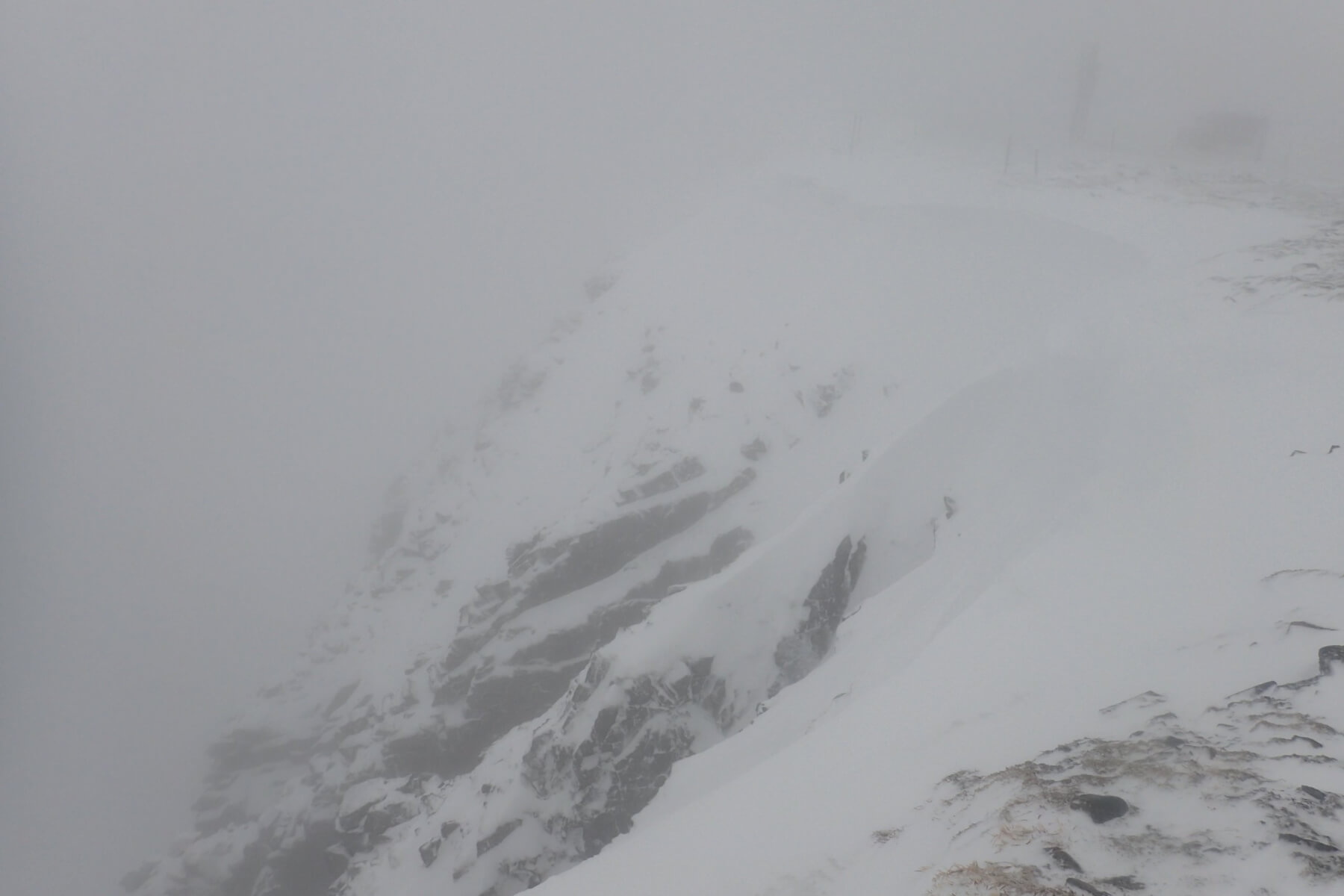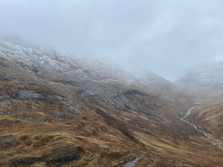 The South side on Ben Nevis disappearing into the mist. Being the windward side of the mountain, this side is holding much less snow than the other side.