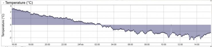 The temperature on the summit of Aonach Mor showing a steady decrease in temperature until early afternoon today. Interesting that it is uniform decrease when it was above freezing, but shows various fluctuations once the temperature dropped below freezing. I am not sure if these fluctuations are due to the shower that were coming through, or something else.