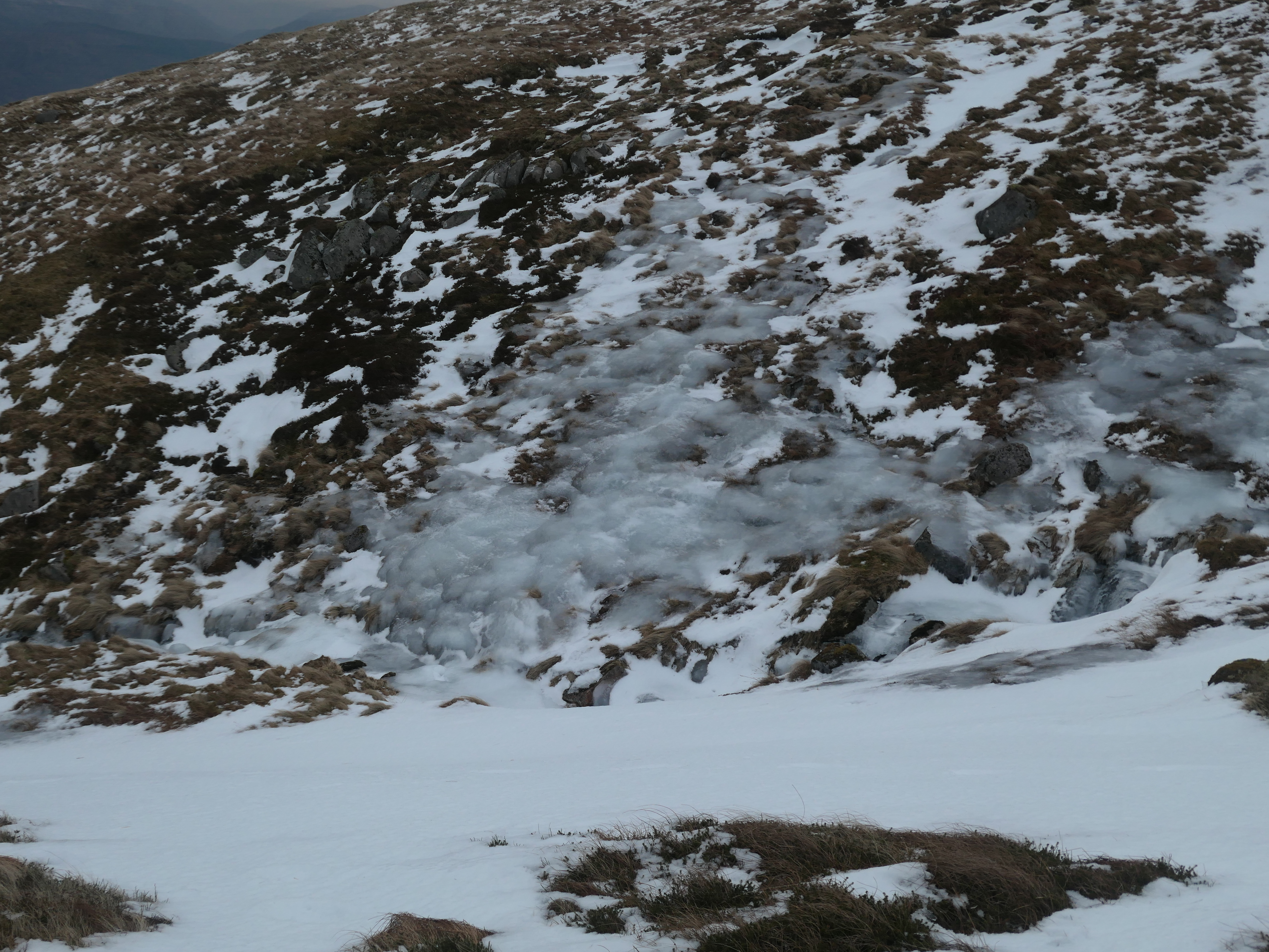 Today will mark the end of a very settled period of weather. For the last 2 weeks we’ve had a mainly South-Easterly wind, strong at times, low temperatures and minimal precipitation. It all changes overnight, and tomorrow there will be rain to summit level and above and gale force South-South-Westerly winds. Much of the snow cover at the moment is a fairly thin layer and this will thaw quickly in these conditions. Ice and the deeper areas of snow will take longer to melt. The temperature is forecast to be above average for the time of year until the end of the weekend so it will be interesting to see what survives the thaw.