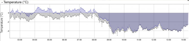 I got caught out slightly by the temperature today. I’d noticed before I set off that the summit temperature on Aonach Mor was around zero but a couple of hours later it had dropped to -4 degrees and combined with a very gusty wind there was significant windchill. The graph below clearly shows the quick temperature drop between 08:00 and 09:30.