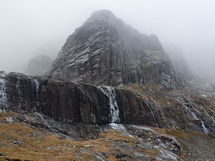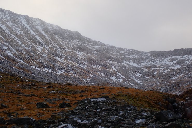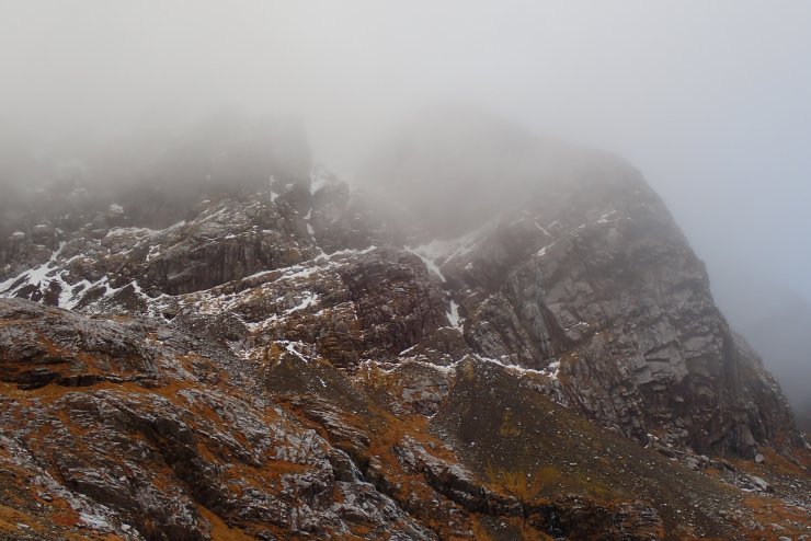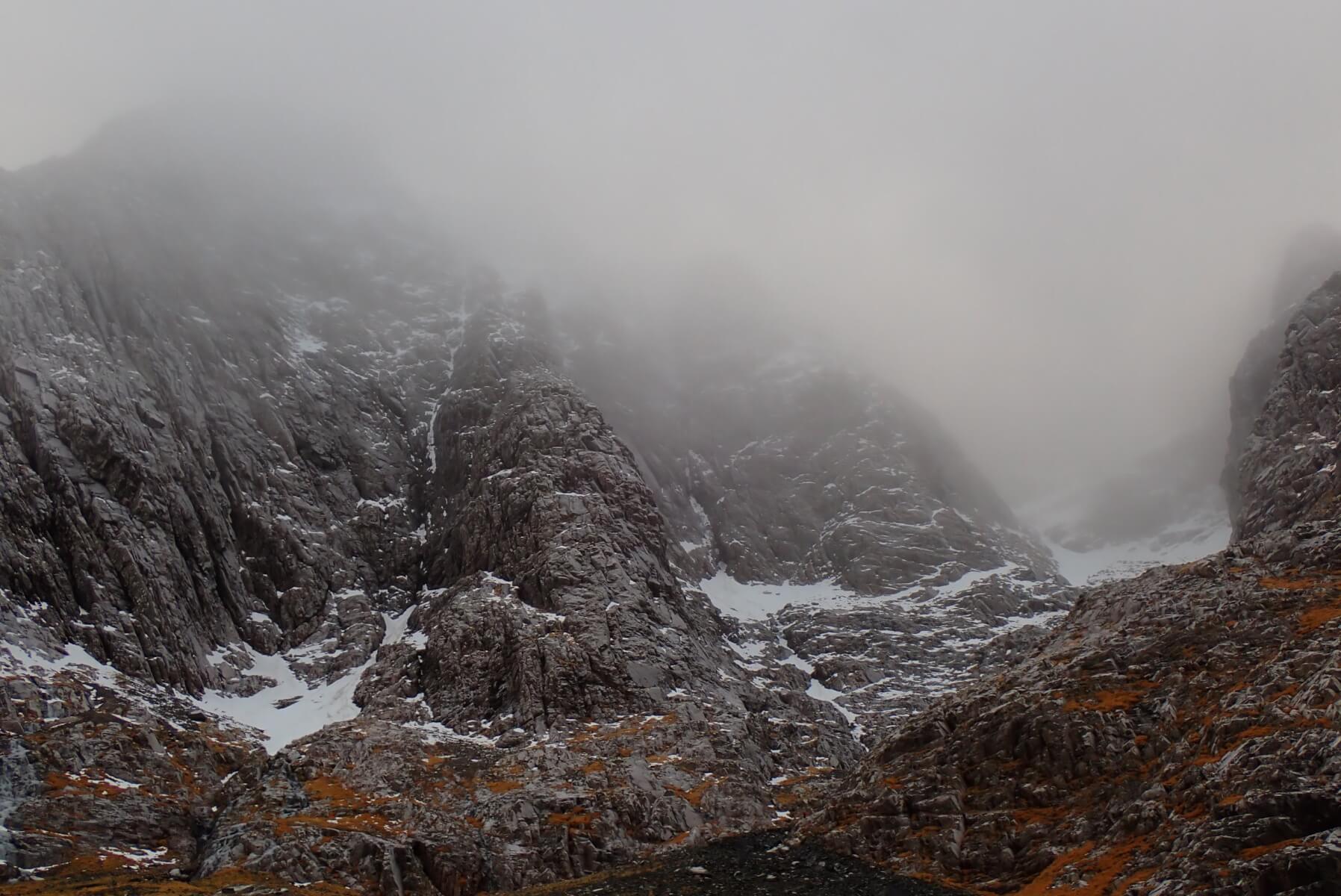 Looking up to the Carn Dearg Arete at the head of Coire Leis. This was as clear view as I got all day, there looked to be a slight dusting of white stuff (possibly snow, but more likely just hoar frost) at higher levels.