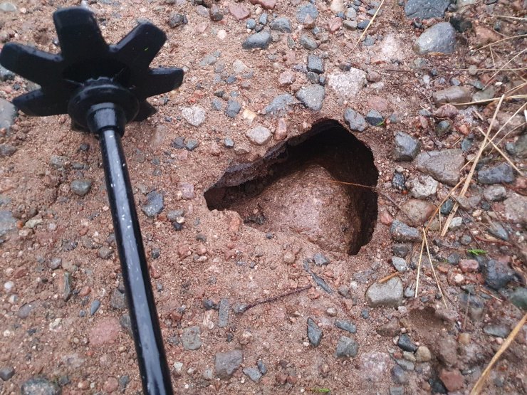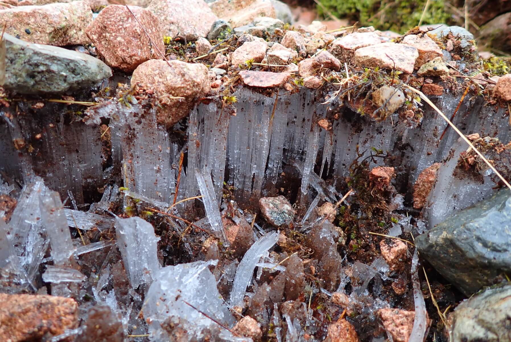 The expansion of the gravel footpath due to it’s high water content expanding while the rock which contains little water has not expanded, and thus has been left behind. Ski pole for scale.