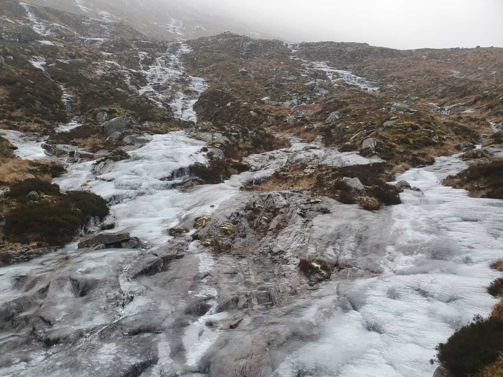 The CIC hut cascade with Carn Dearg Buttress behind. Only a thin layer of ice on the CIC hut icefall, and very little ice on Carn Dearg Buttress above.