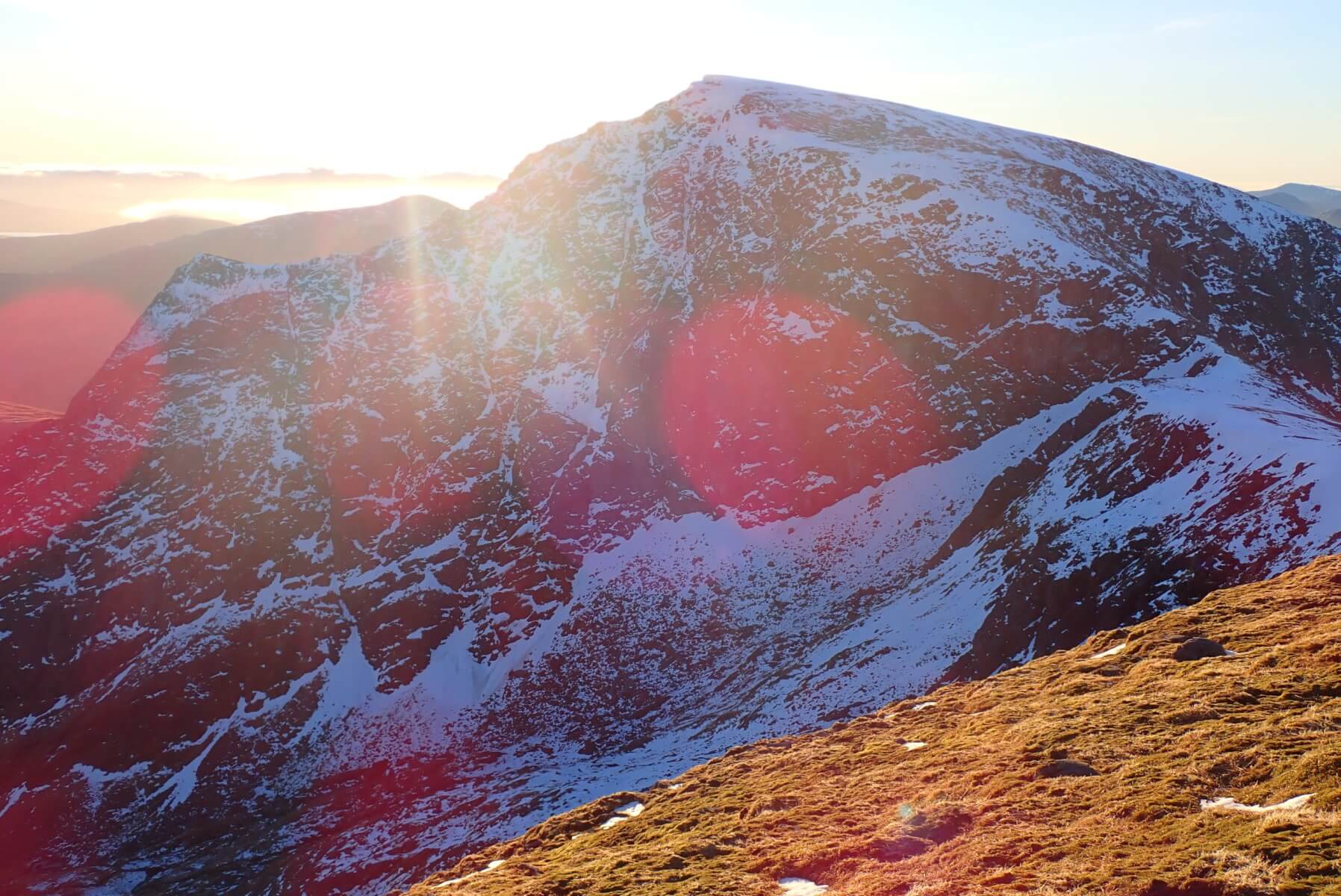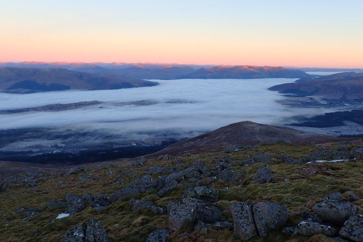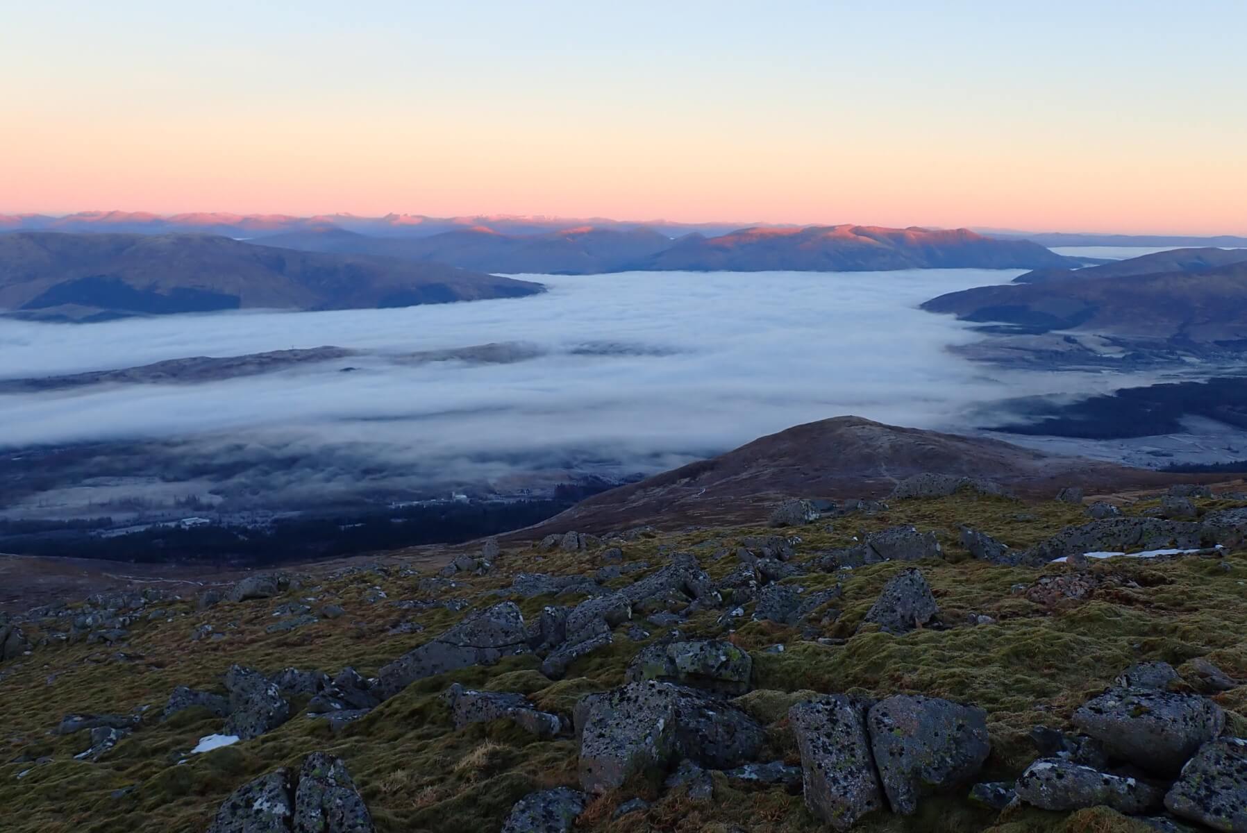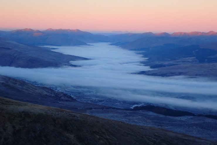 As the title suggests it was another fine day on the hills in Lochaber. I was not so nice down in the freezing fog which hung around all day near various large bodies of water such as Loch Eil, Loch Lochy, Loch Oich and getting further away Loch Ness. There looked to be a band of fog running the whole length of the Great Glen.