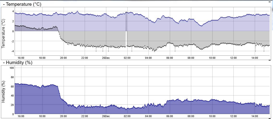 Humidity was very low on the summits. Low relative humidity on the summits is something we see most years, and has been discussed in a couple of times previously on this blog, see the 5th of Feb 2023 and the 19th of Dec 2021 On those occasions relative humidity got down to about 20% (based on the Holfuy station on the Aonach Mor summit hut). According to the Holfy station it got down to just under 10% at around 2am last night, see graph below. However, the nearby Met Station gave a reading of around 5% at roughly the same time. Looking at the graph of humidity distributions (seen in the 19th of Dec 2021 post), such low humidity’s are recorded about once in a thousand days on Aonach Mor. They also virtually never occur in the UK at low land sites. According to a BBC news article which is also linked to, there is only one reliably documented instance of a humidity below 10% at any lowland site in the British Isles. This was at RAF Honington in Suffolk where the relative humidity fell to 8% at 1400 GMT on 30 June 1976. Further East the weather station on the summit of Cairngorm recorded a relative humidity of 2% yesterday. I don’t know how accurate this value is, and if this is a UK record. These are certainly unusual conditions.