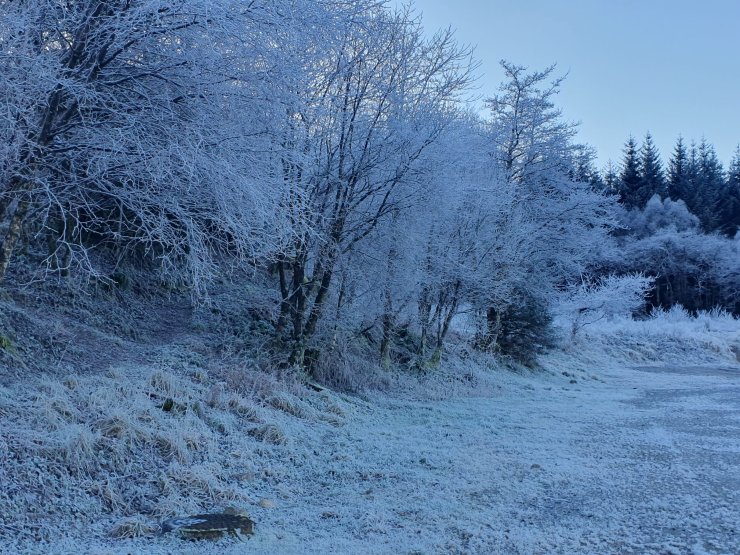 Frost in the trees down in the glens. In shady locations the trees and ground were covered in frost all day.