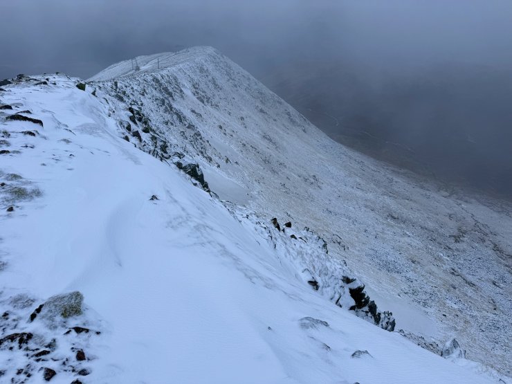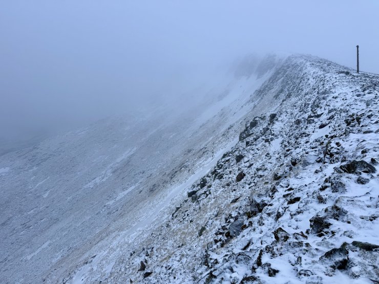 After a little overnight snow there was a dusting above around 900m. During the day there were some, mainly light, showers falling as snow above 900 metres, with the freezing level was around 1000 metres. The cloud base hung around 1000m while I was on the hill.
