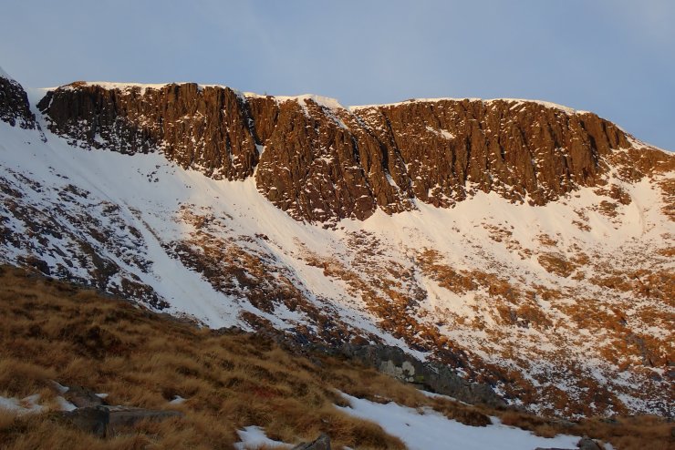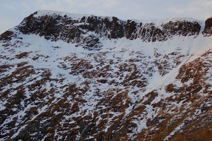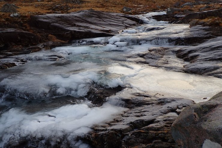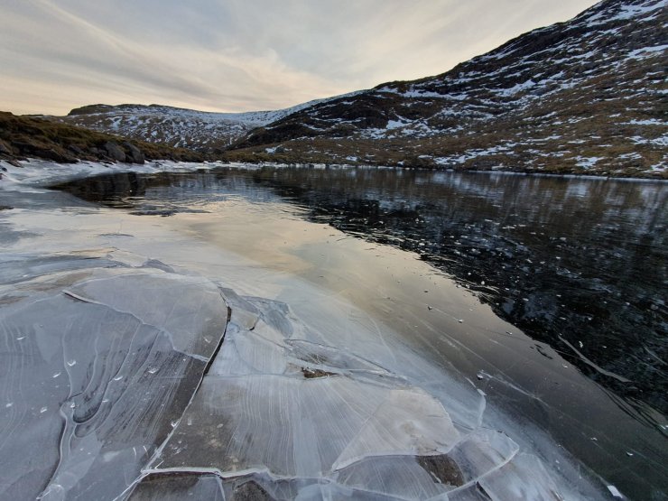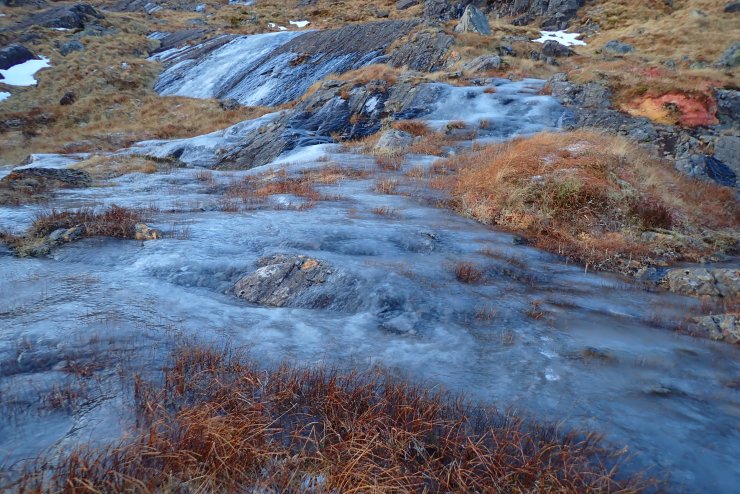 Water ice on hillside makes for a slip hazard. I once saw someone slip on a patch of ice such as this, they picked up speed very quickly but fortunately didn’t hit any rock when they shot of the end onto the heather.
