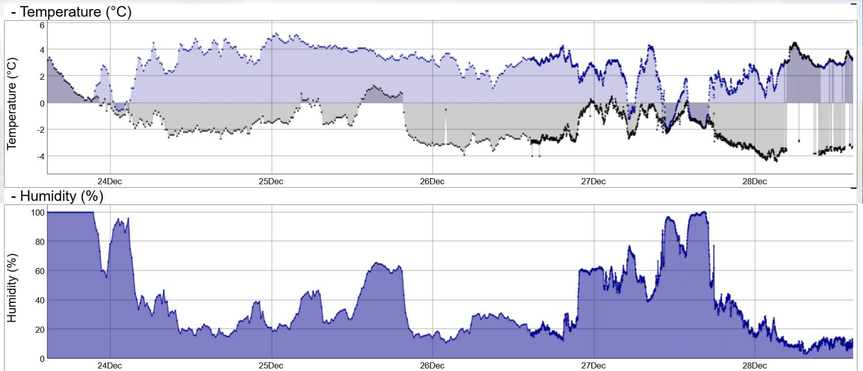 Temperature and Relative humidity at the holfuy station over the past 5 days. Both have been up and down a fair bit, with high humidity associated with the approaching cloud yesterday being visible, and the very low values of Relative Humidity today.