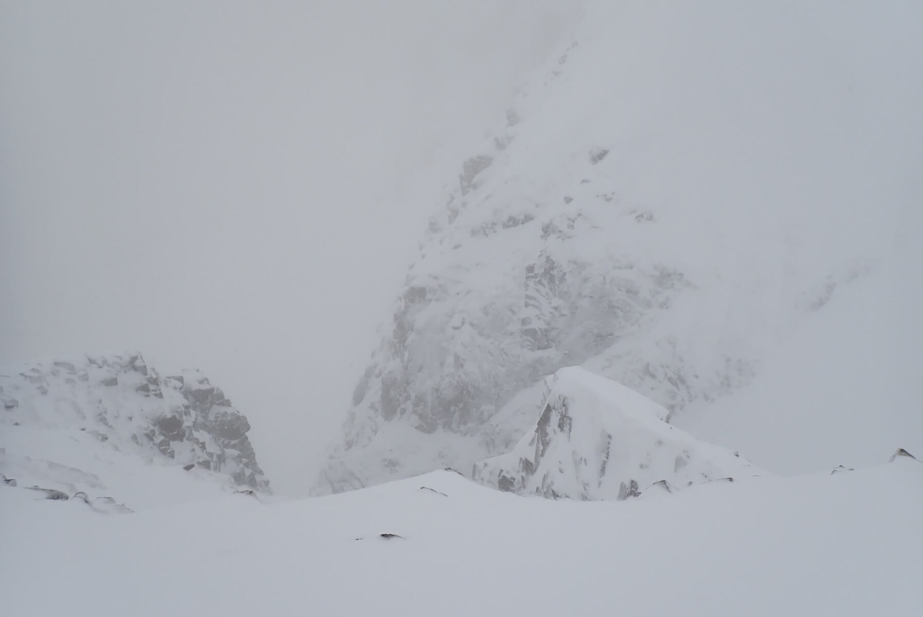 Looking down Easy Gully. In the flat light and blowing snow it was hard to tell how much the cornices had grown since yesterday.