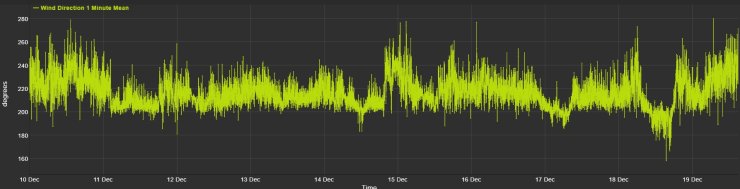 Wind Direction every minute for the since midnight on the 9th of December from the Met Tower near the summit of Aonach Mor. It is impressive (although not in a good way if you like winter) of how consistent the wind has been from the South-South-West to South-West. Associated with that has been the weather, other than last Friday it has been cloudy, damp and relatively mild. However, a change in weather pattern is forecast early week.