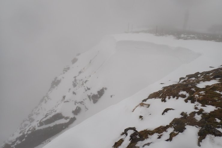 The top of Easy Gully. Hard to make out but the crown wall from a recent avalanche can just above be made out running from the rocks on the right diagonally up and left towards the cornice. It then runs along the cornice (it may well have been cornice triggered) to above the rocks on the far side of the gully. The darker snow on the far side of the gully is caused by the fresh white surface layers of the snowpack being removed as part of the avalanche reveling the old, hard grey snowpack underneath.