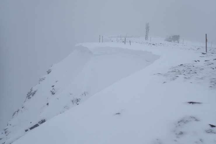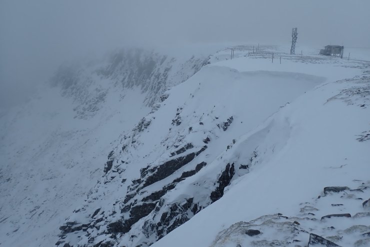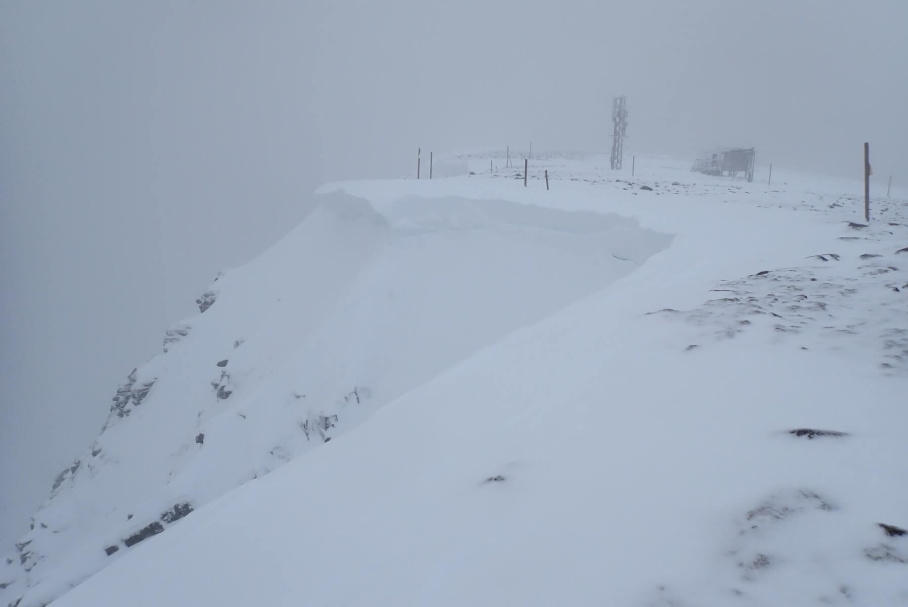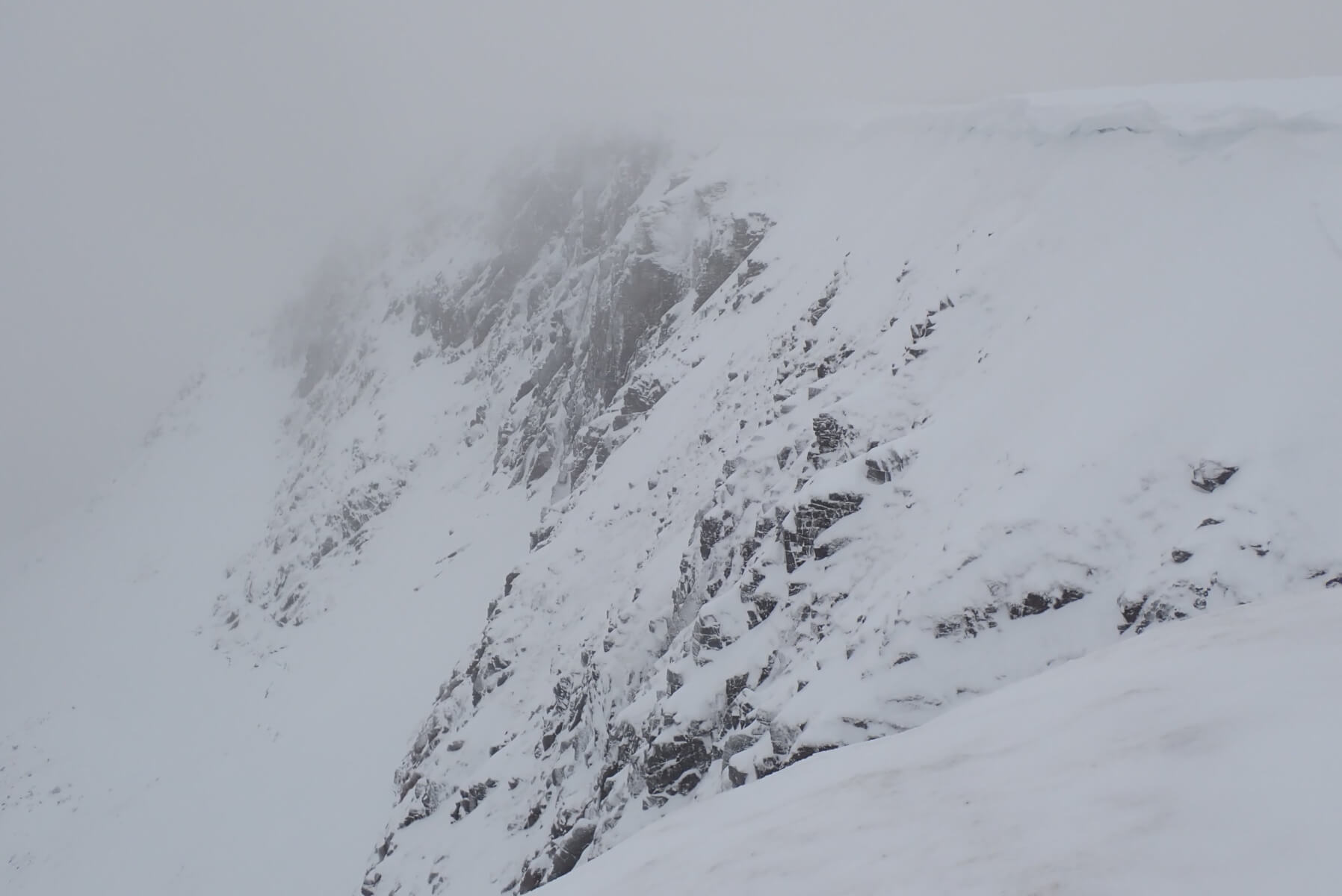 The area around the top of right twin taken today (Saturday the 20th). Below are a series of photos of the same location from earlier in the week which quite nicely show the development of the snowpack. The cornice in particular is significantly bigger today than it was on Thursday the 18th (photo below).