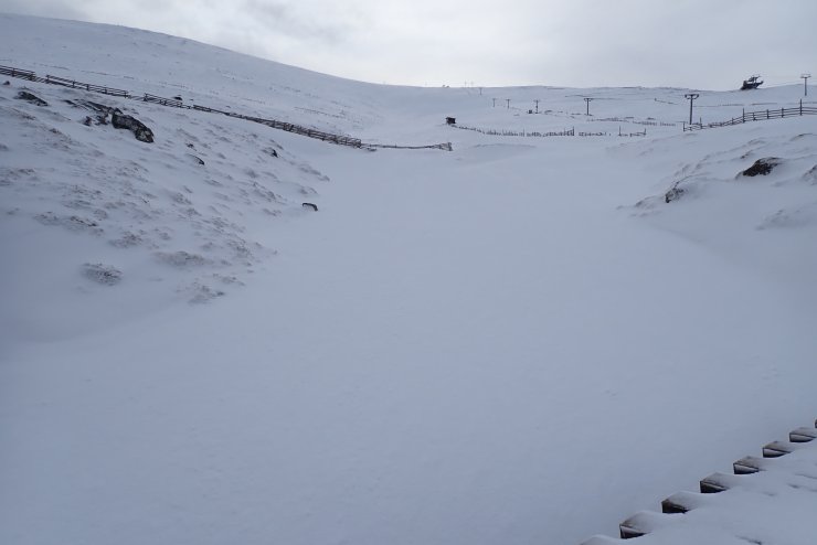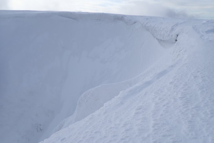 The top of Easy Gully. The cornice is still there but is rimed up with the strong winds which would have been blowing up the gully yesterday. In the gully itself patches of very shallow fresh and whiter snow can be seen sitting on top of the old firm icy and grey snow pack surface.