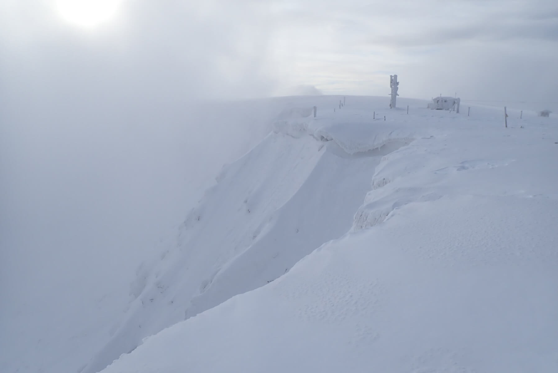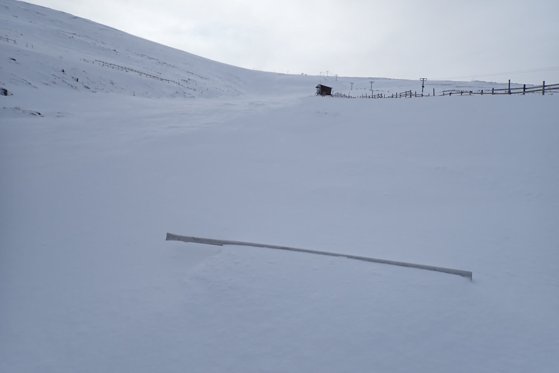 A snapped metal pole lying in the snow. I assume this was blown here from wherever it was previously (presumably somewhere within the ski area) by yesterday’s storm force winds. Was it snapped by the winds, am not sure. I would say that that would be possible, particularly if it had been covered by a thick layer of rime which significantly increased it surface area and thus resistance to the wind.