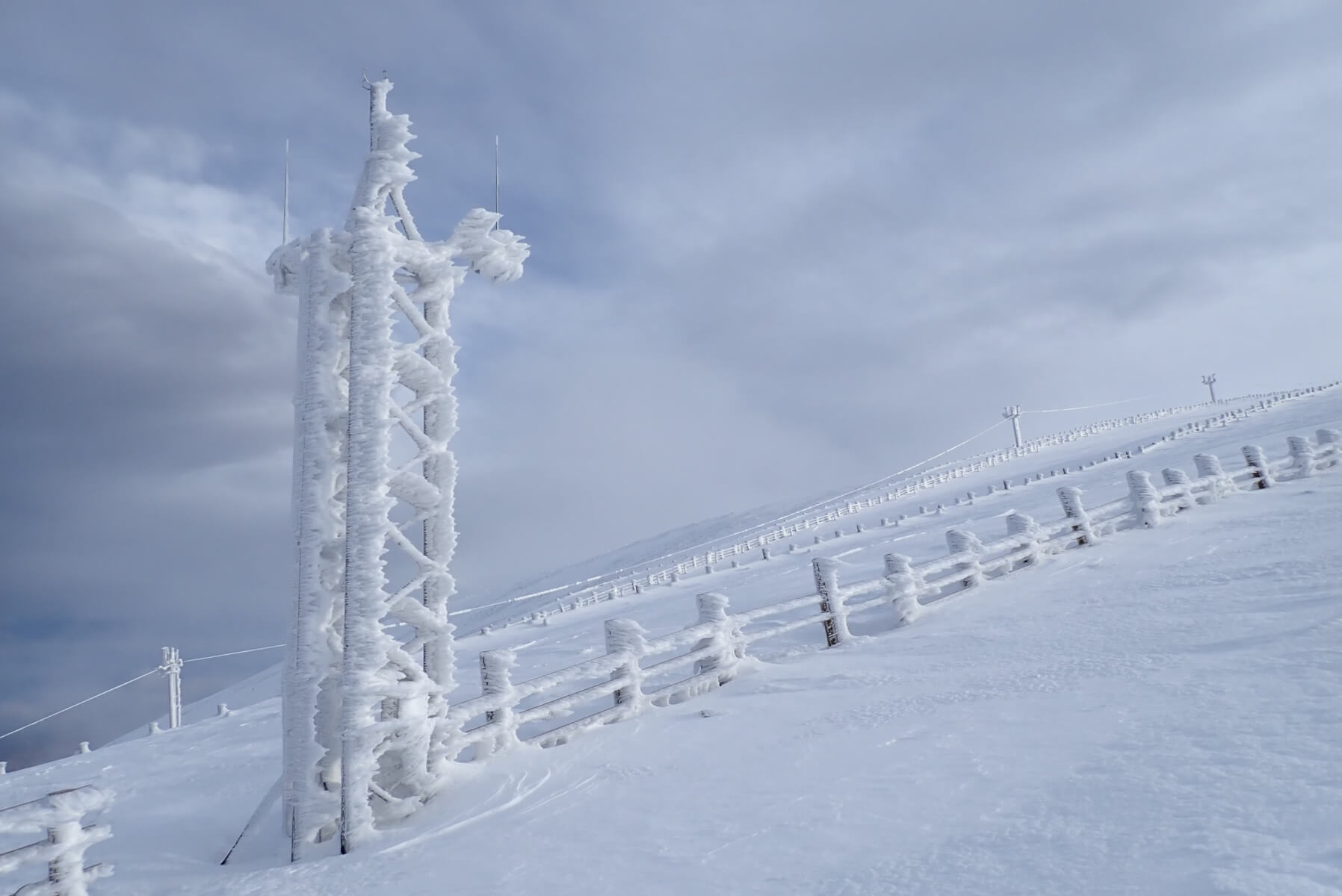 The Met Tower well rimed up. This layer of icy rime is not actually from yesterday, it formed a few days beforehand. Note the two ariels like things on the top the tower are almost free from rime. They are whip thermometers which are designed to bend in the wind to shed any rime which is building up on them.