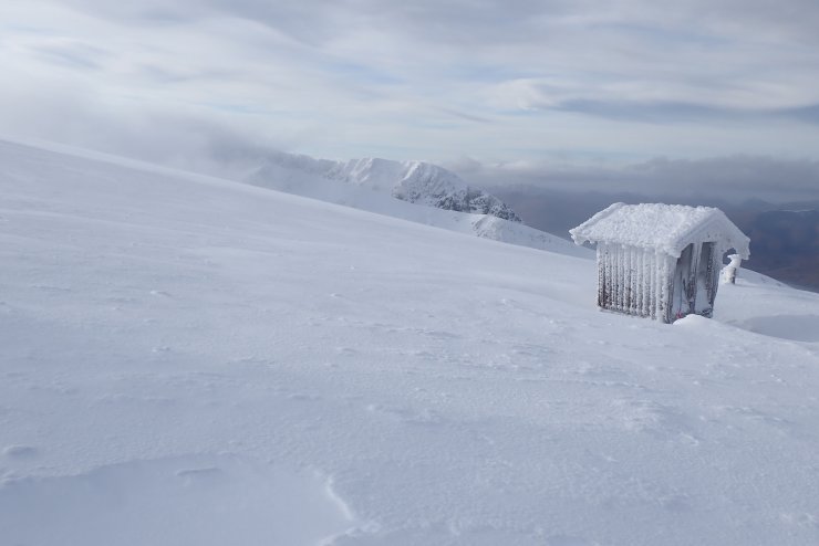 The so called Cuckoo Shed at the top of the ski area with Carn Mor Dearg and Ben Nevis behind.