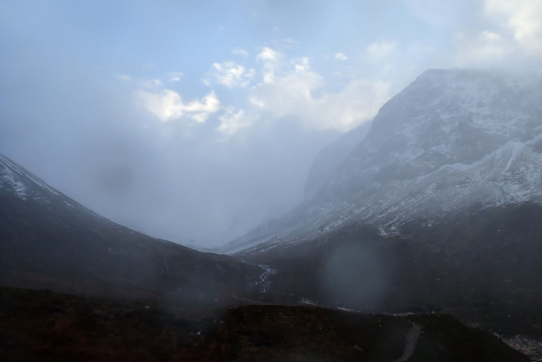 Another day with a strong South-Easterly wind. The tops were in the cloud, and there were a few light snow showers on the hills during the day. Any from the hills the glens spells of sunshine. I was on Ben Nevis today, not much change to 3 days ago when I had been up, a lot of the photos in this post are very similar to those posted the in the blog three days ago. Looks like more of the same tomorrow.