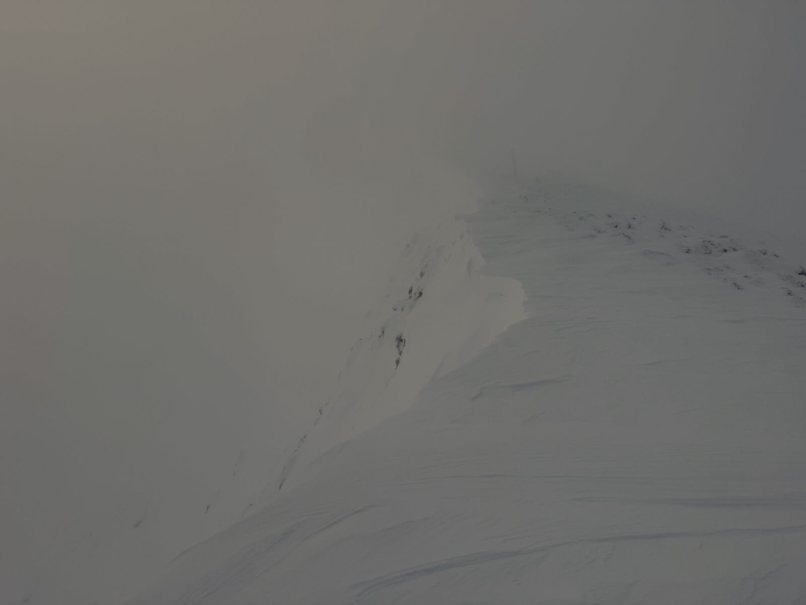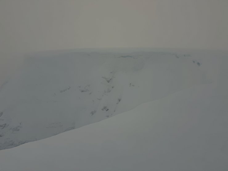 The South-East side of Easy gully with windslab and cornices. The other side of the the gully has less snow. This is more snow than any where else on Aonoach Mor, although a lot of varying sized fragile cornices do exist.