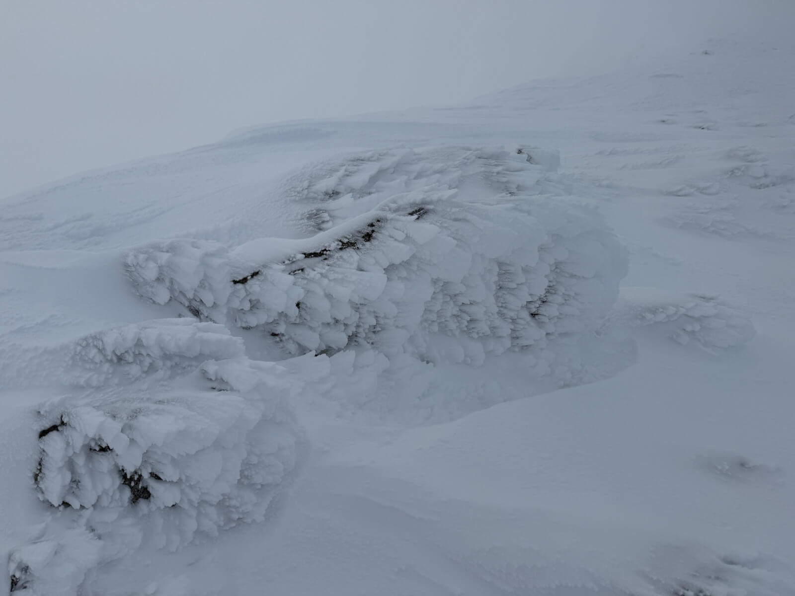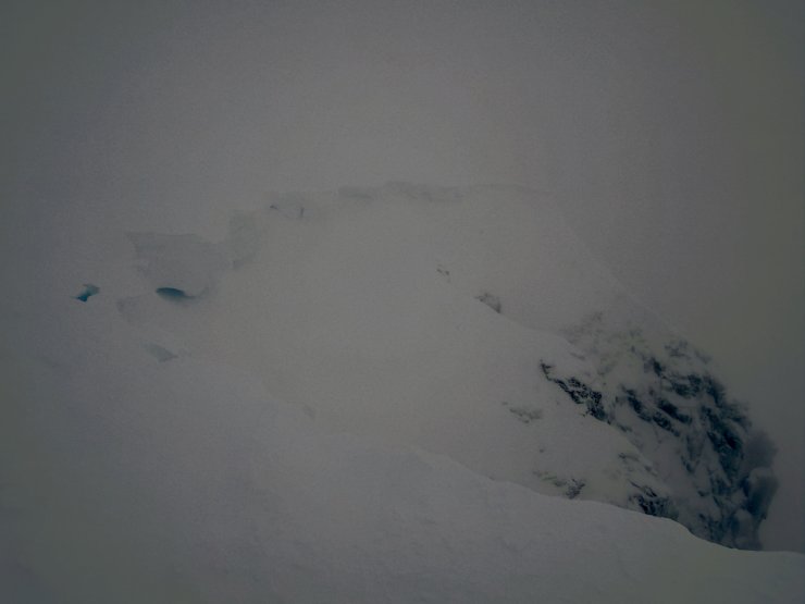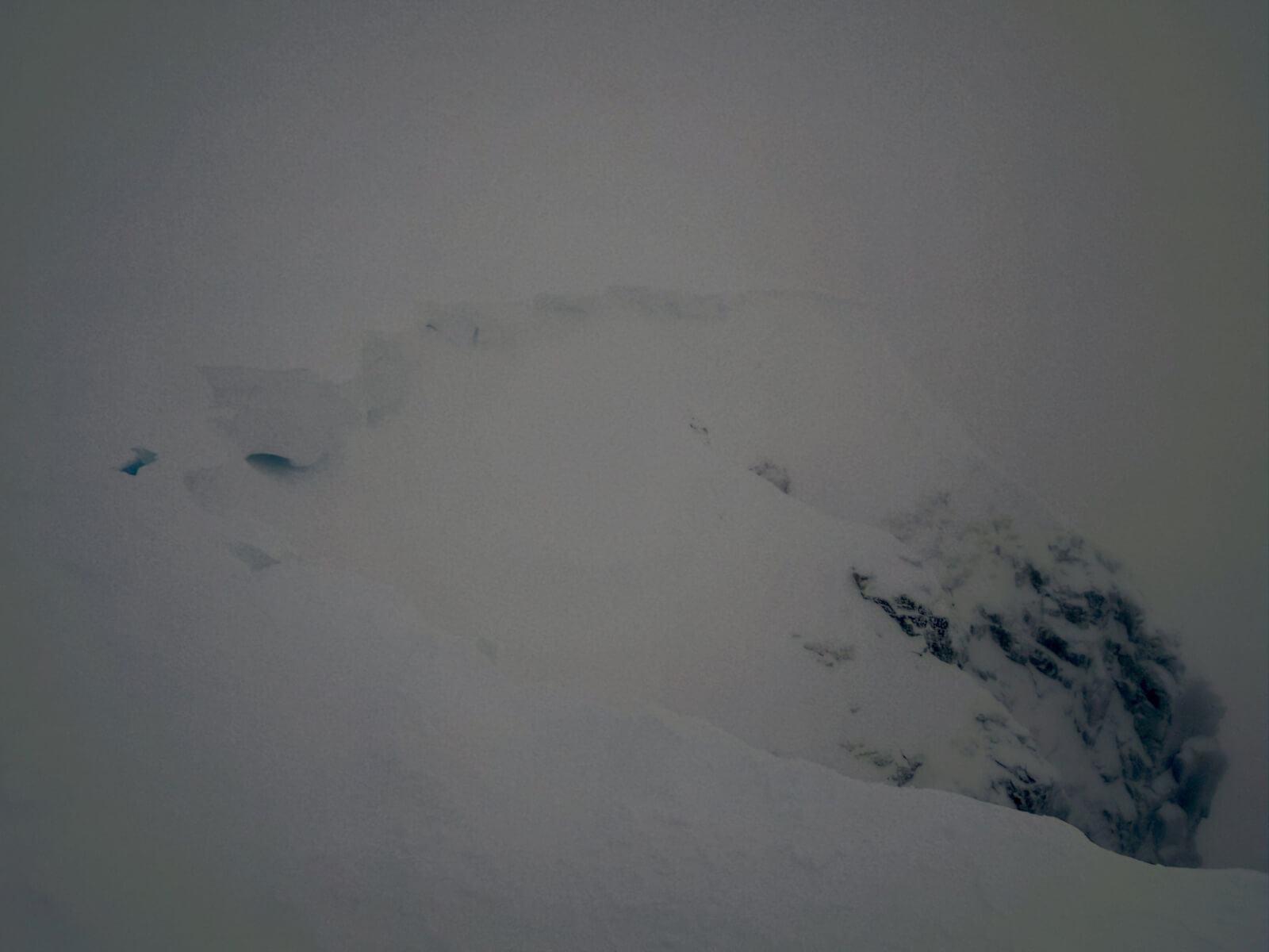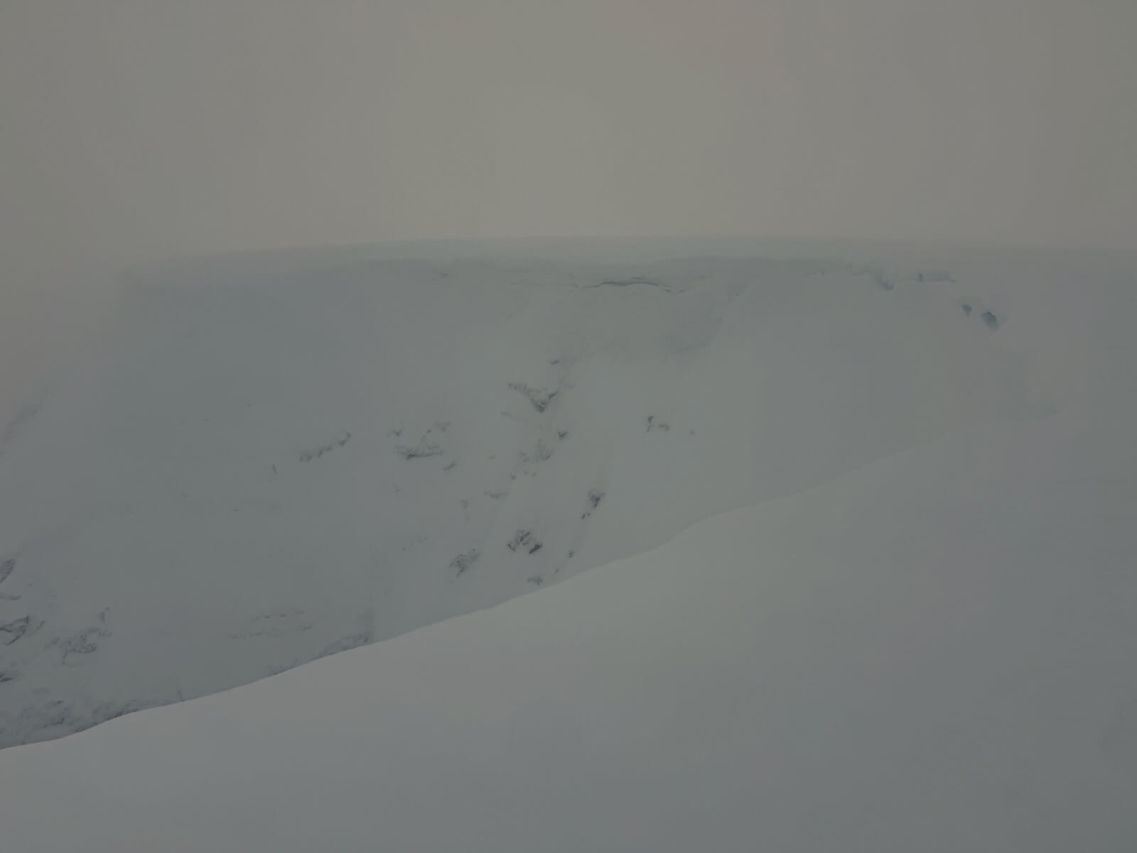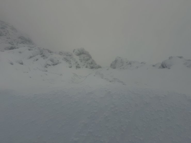 The North-East facing slopes of easy gully. If you look closely you can see where the windslab ends and becomes rocky with firm snow. Although this is very firm snow with rocks and very serious.