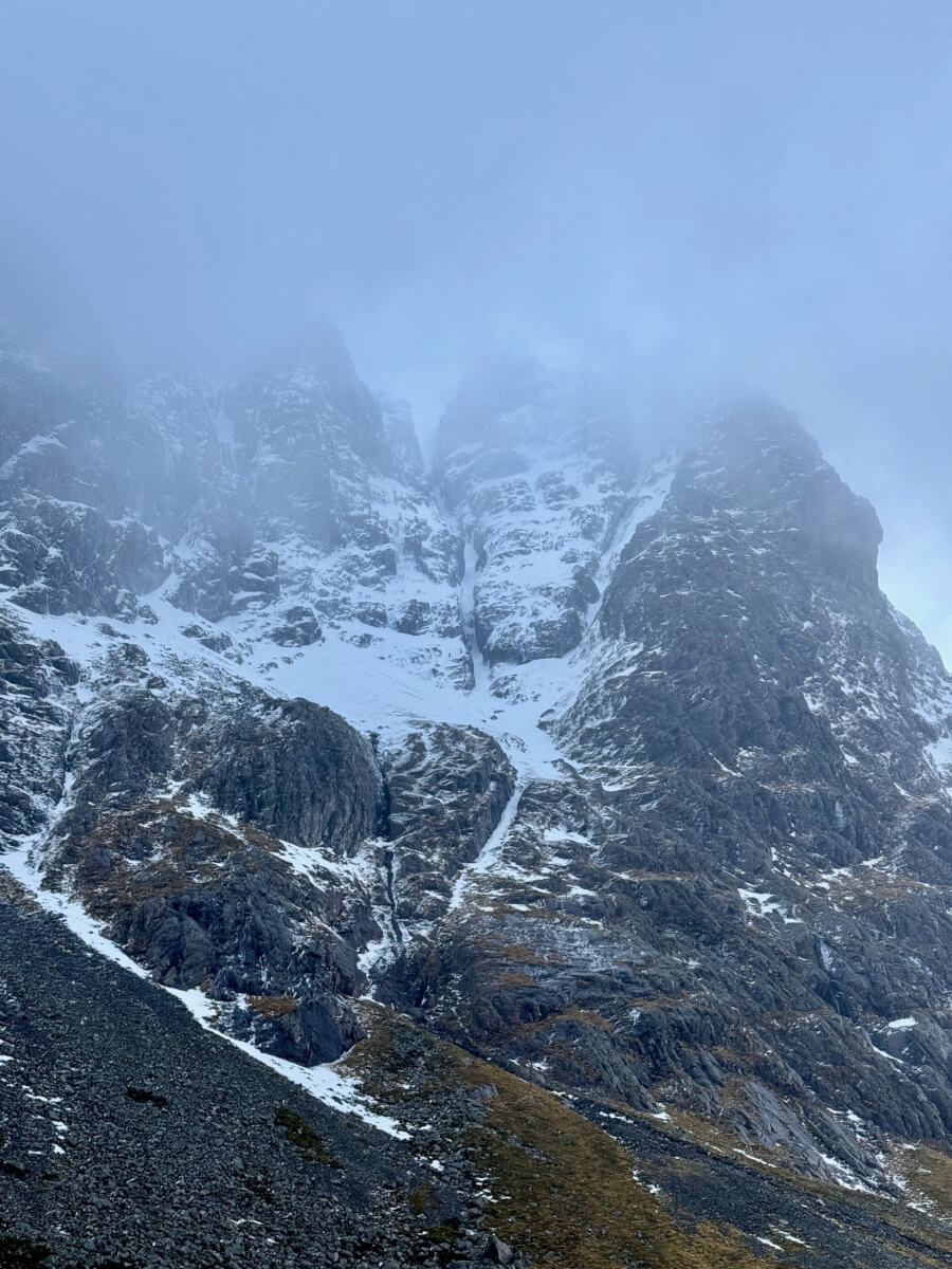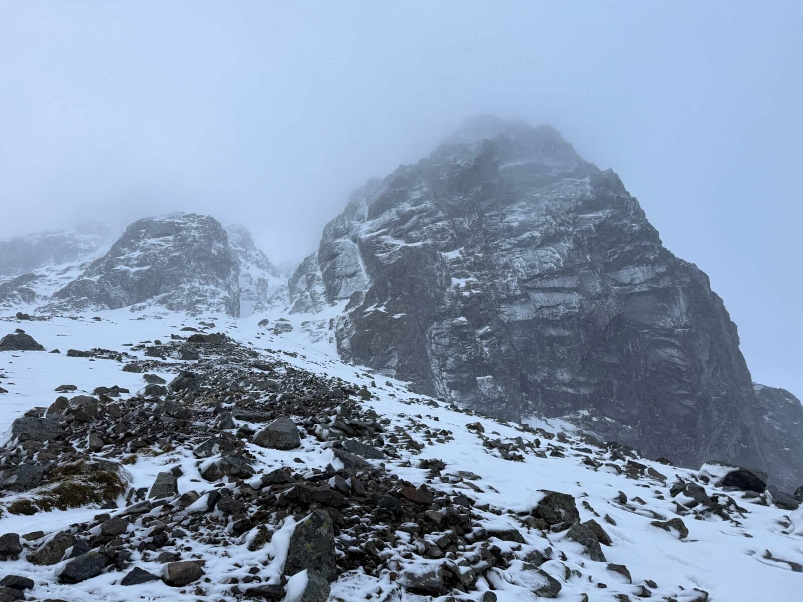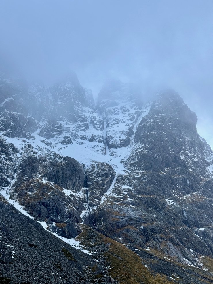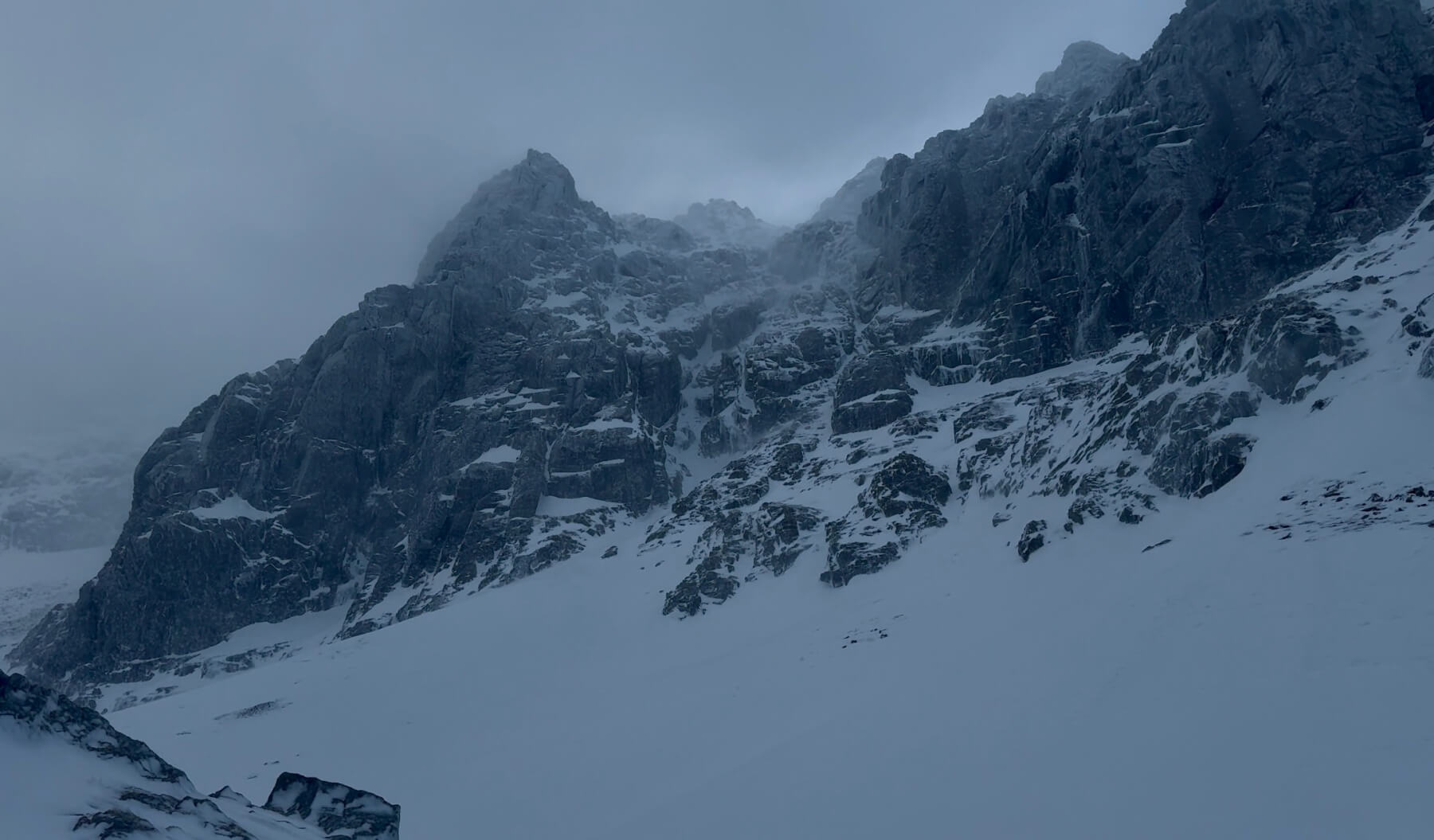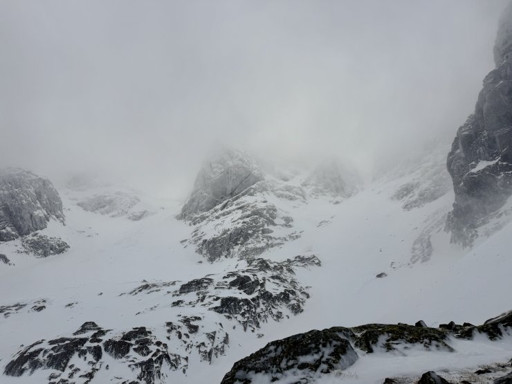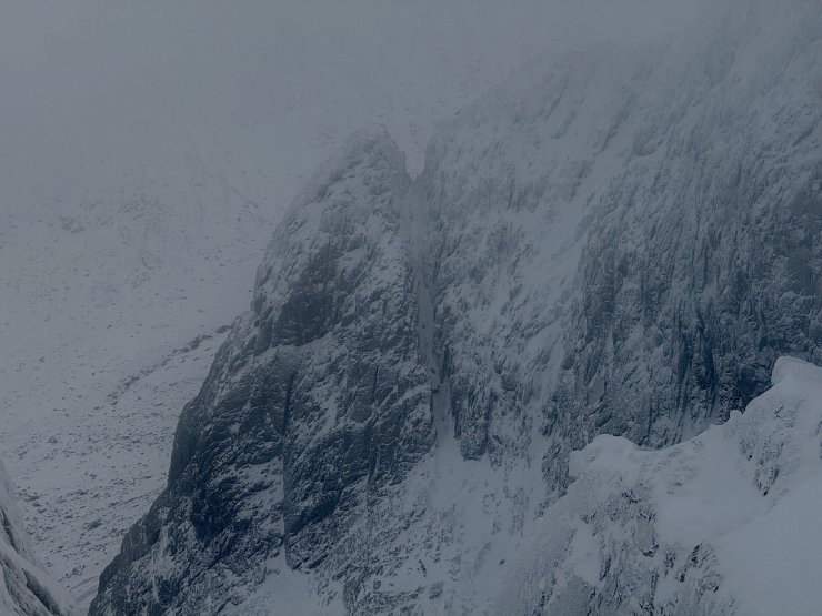 Another day of very strong and, in many places, variable winds. Today’s observations were from Ben Nevis with many climbing teams turning round due to the strength of the wind and others climbing at lower elevations. Below the CIC Hut precipitation was rain and winds were South-Easterly, higher up in the coire winds were very variable blowing snow one way then a few minutes later the other way. Many slopes were a firm crust, fairly thick but when you did go through often knee deep soft snow underneath. While most slopes were scoured, the variable nature of the wind means pockets of windslab are possible on any aspect. Significant snowfall is forecast overnight so windslab will continue to build, higher up at gully tops and coire rims accumulations could gain depth rapidly given the windspeed. In the corries a more variable wind effect is possible again and with pockets of windslab possible on any aspect despite wind exposed slopes being mainly scoured.