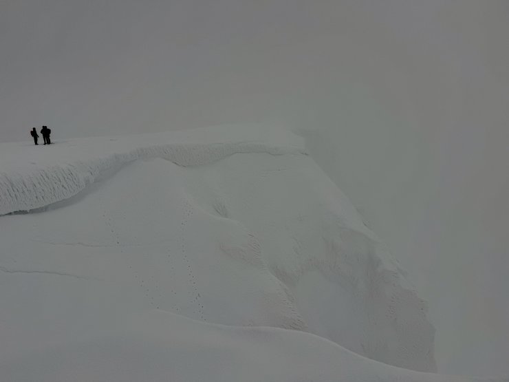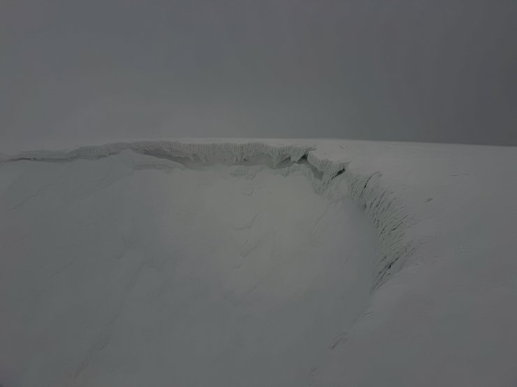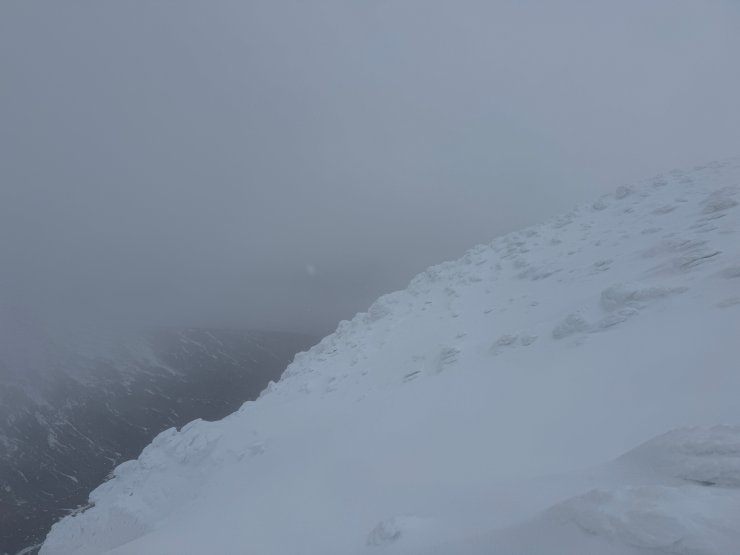 Cornices round the top of of North side Easy Gully Aoanch Mor. While the cornices are not as large as they often are the significant riming adds to the cornice issue, this has formed in the recent strong South-Easterly winds. The same conditions are present along the whole of the East face of Aonach Mor.