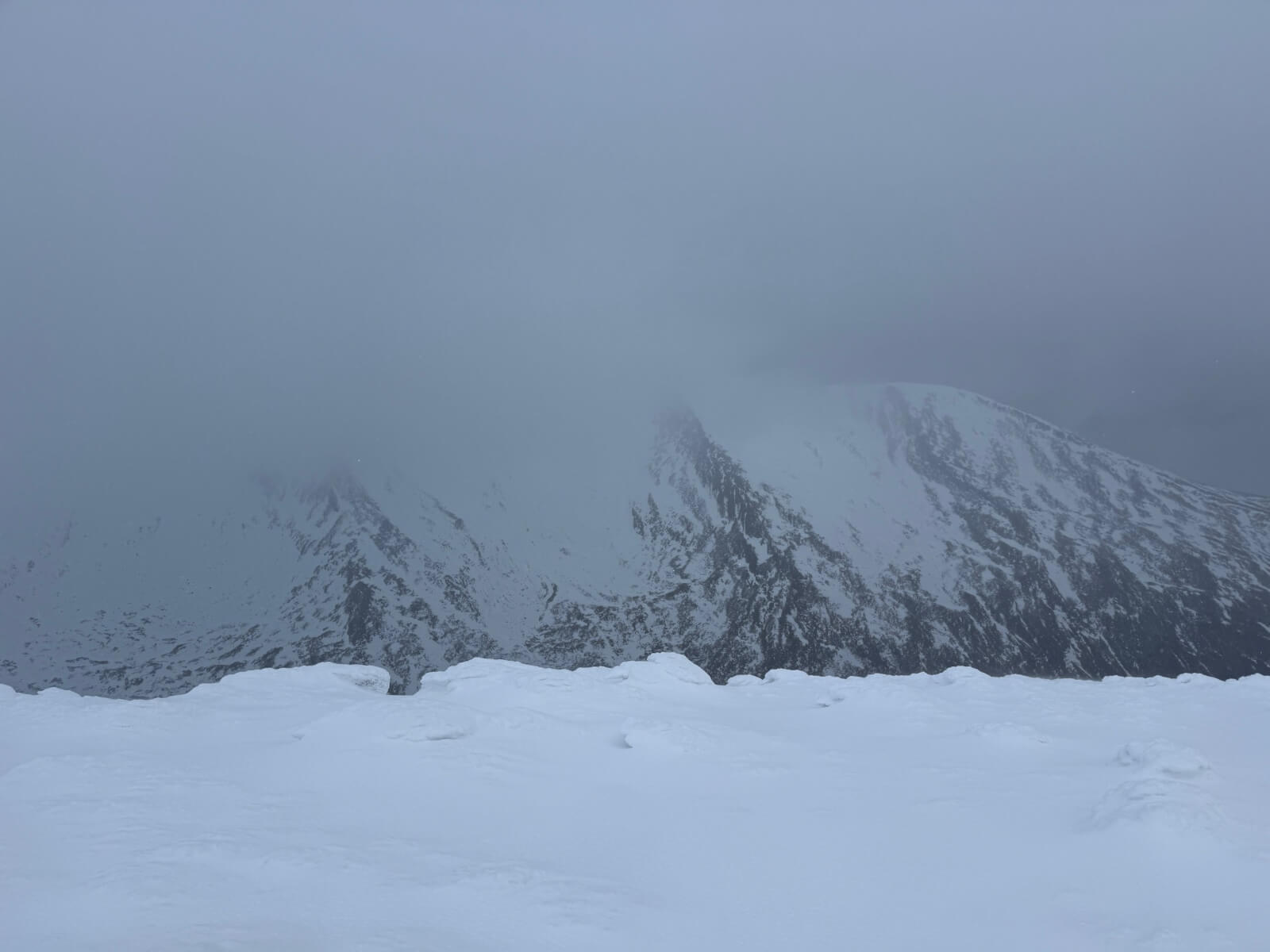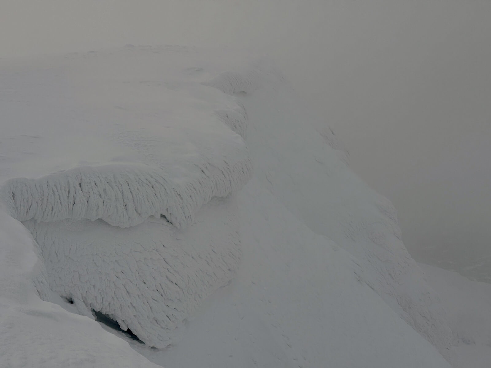 Today was warmer than recent days with a gradual thaw at most elevations. The freezing level was around 1200 metres with some wet snow on the highest summits. Despite the thaw there is still a significant amount of rime above around 1000 metres, this includes on a lot on the cornices on the East face as seen in the photos below.