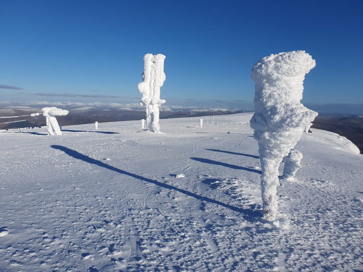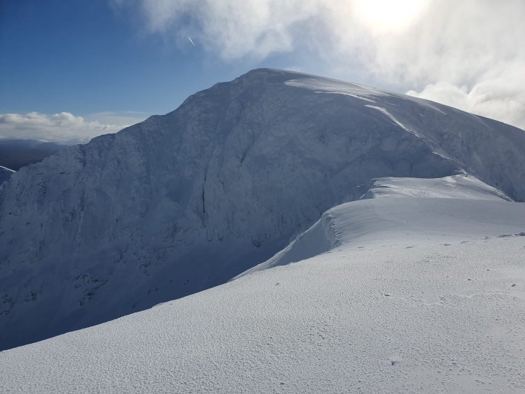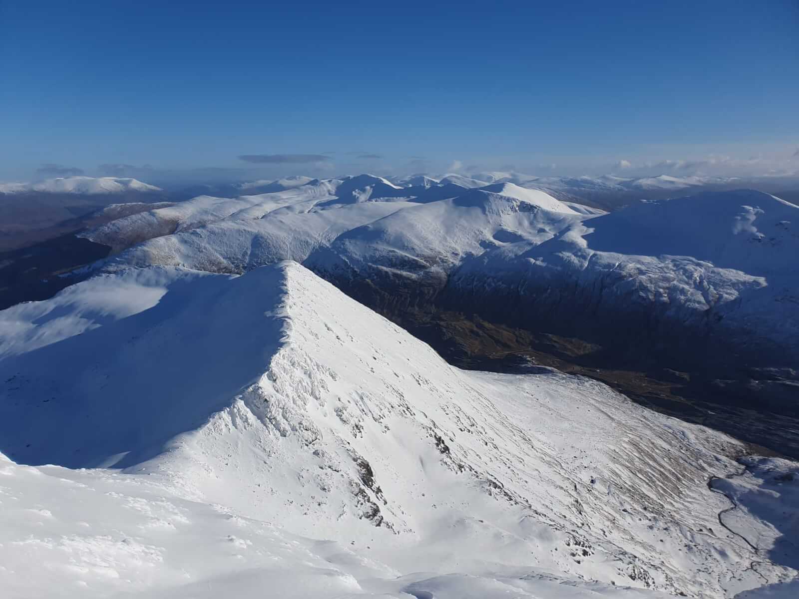 A stunning day in Lochaber today. It was feeling pretty chilly on the tops with the air temperature down to -9°C this morning, and looks to be peaking around -7°C early afternoon. Due to radiative cooling under the clear skies the snow surface temperature was even colder, -10.5°C where I measured it on a shady NW aspect. I suspect it would have been lower in locations more sheltered from the NE breeze. The low snow surface temperatures set up strong temperature gradients in the snowpack which can decrease the stability of the snowpack. This is starting to happen in the patches of slab that remain mainly on high SW through W to N aspects.