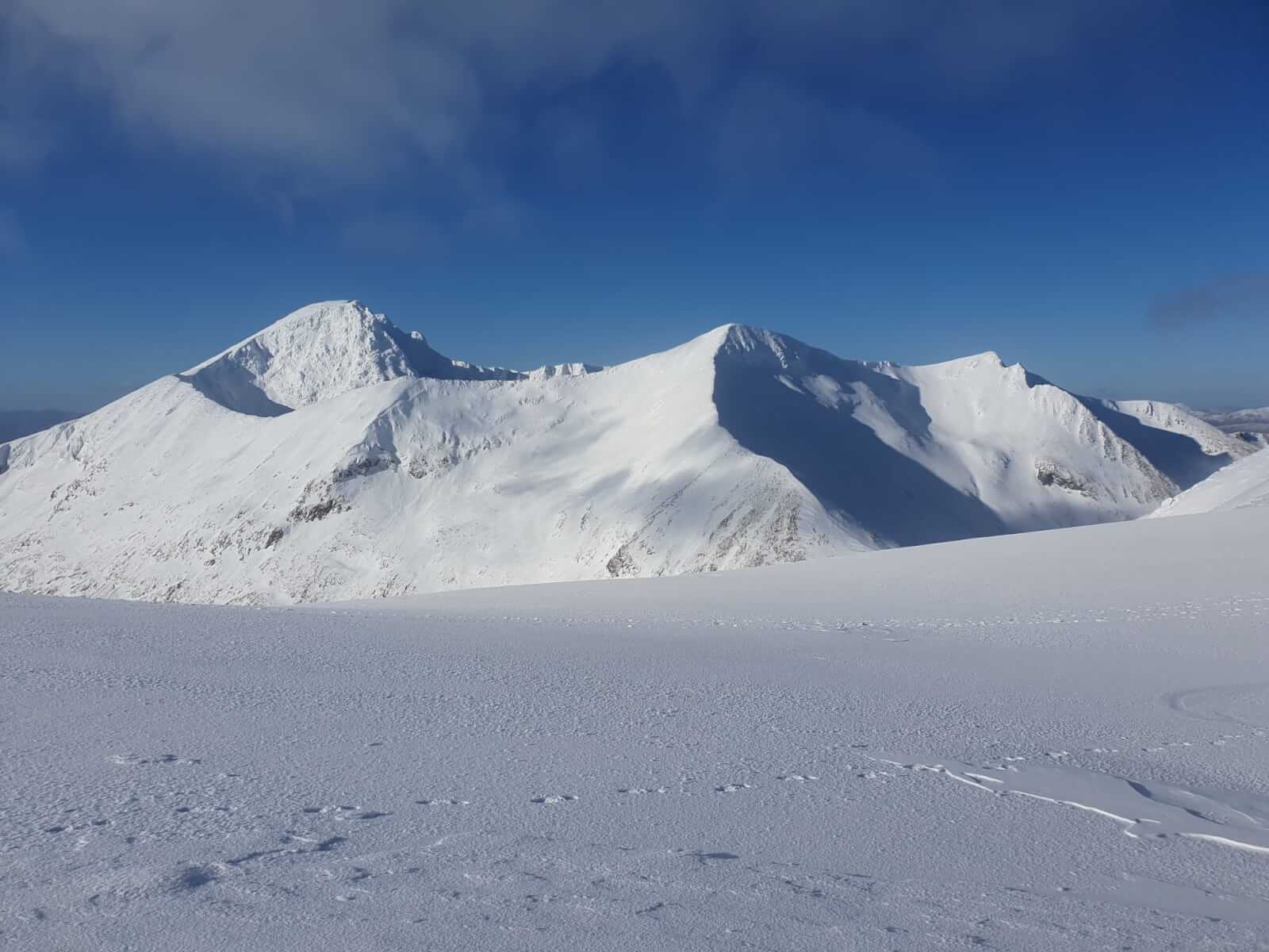 The North side of Coire an Lochan. The crags are looking just as white. A team can be seen at the base of Left Twin.