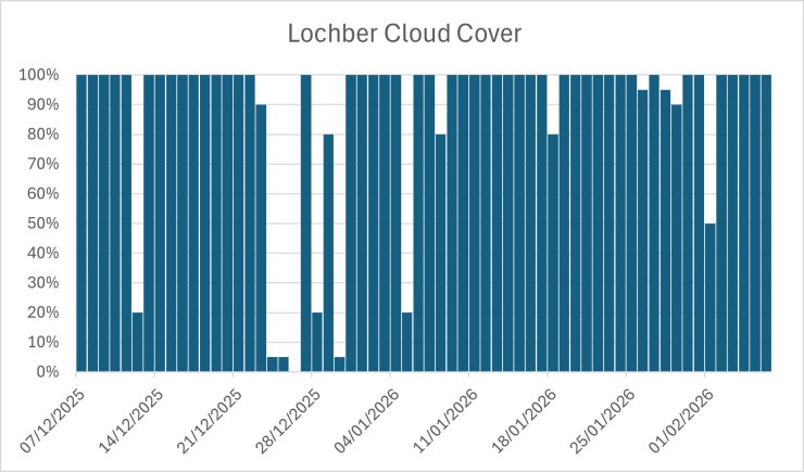The cloud cover from the SAIS daily snow pits. Although the hills in Lochaber in the winter aren’t traditionally the place you would go to top up your suntan, the past few weeks have felt particularly dull. Since the 1st of January there have only been 7 days when the cloud cover was not 100%, and only 4 days when it has been less then 90%. However, it could be worse, I heard that the met station in Aberdeen has not recorded a single minute of sun since the 21st of January, the longest continuous sunless period recorded there.