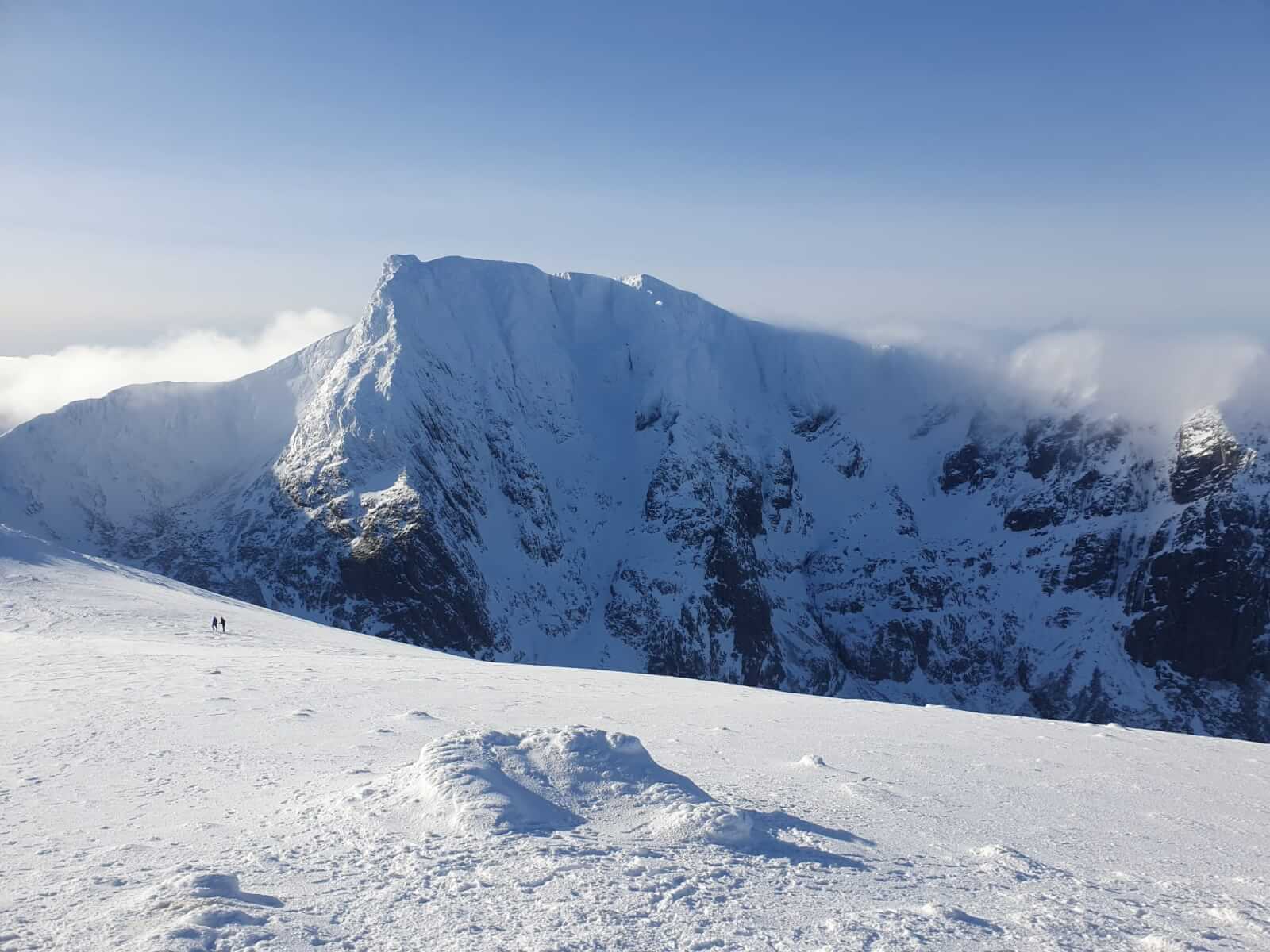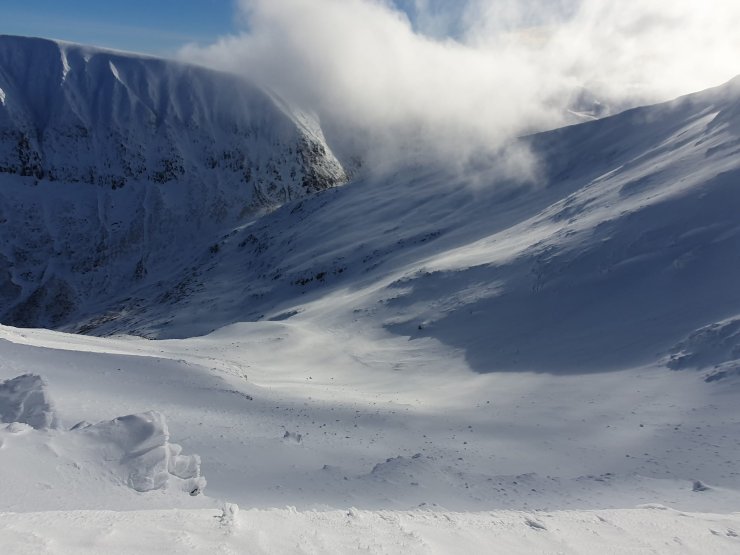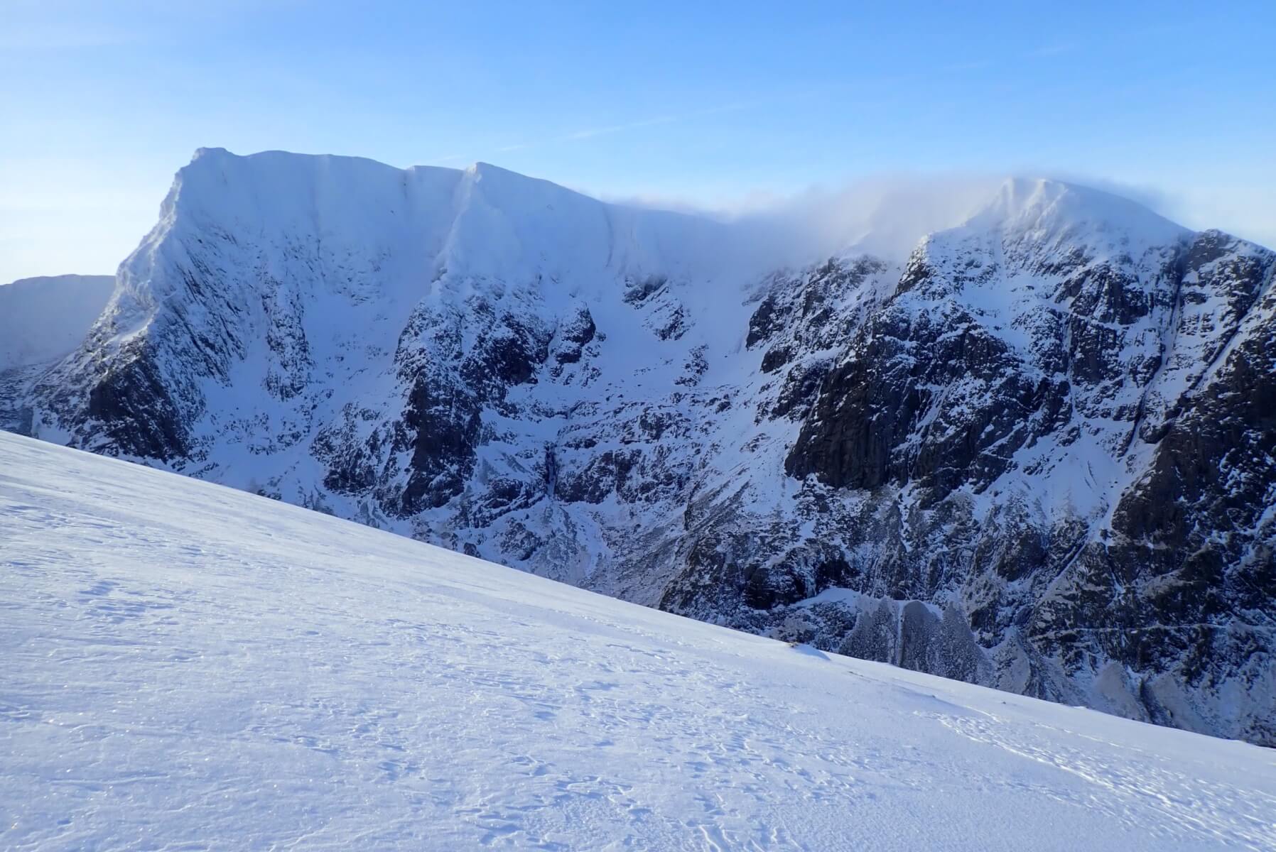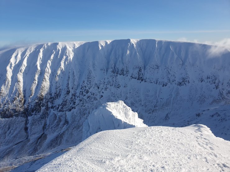 The view down the bowl between Carn Dearg Meadhonach and Carn Mor Dearg. Looks reasonably well filled in at the moment, but with various lumps of cornice and old avalanche debris.