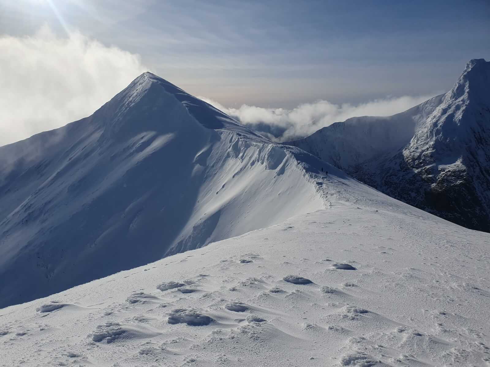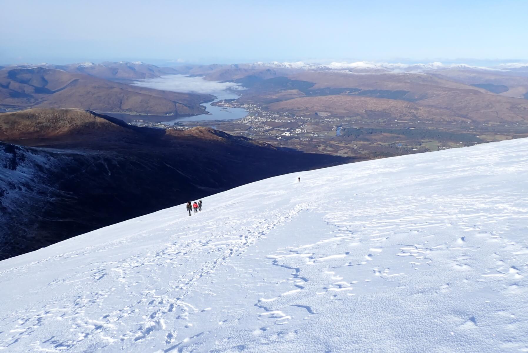 Heading up Carn Mor Dearg. Lots of people out on the hill enjoying the lovely weather today. Winds were light this morning as indicated by the fog over Loch Eil in the background. During the afternoon the wind started to blow and the sky went hazy then cloudy, the first sign of some weather coming in.