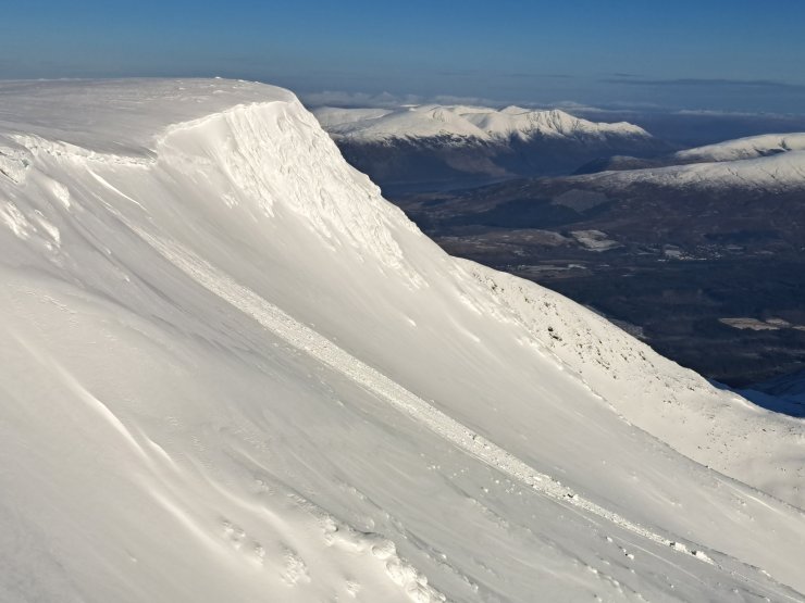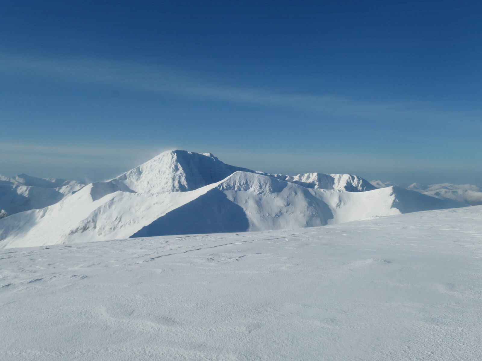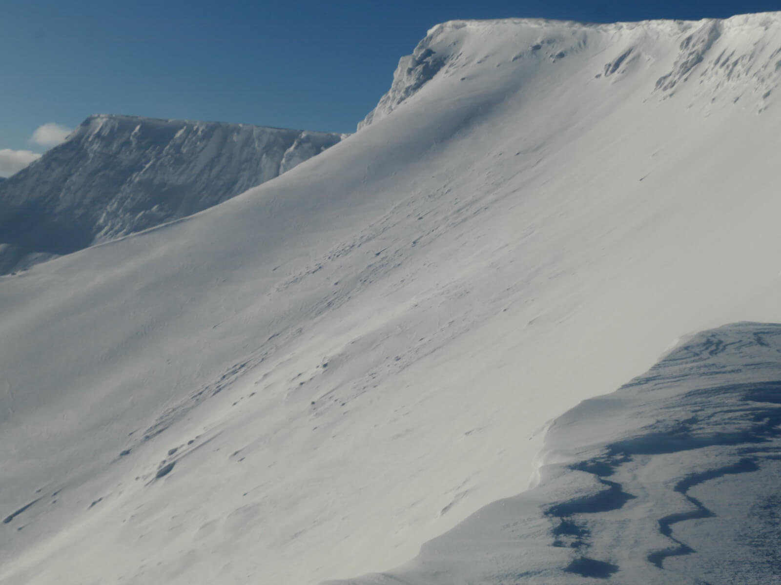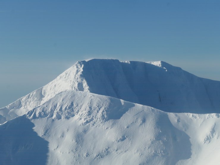 Carn Mor Dearg with Ben Nevis behind. Note the crown wall from a recent avalanche below the ridge to the right of Carn Mor Dearg.