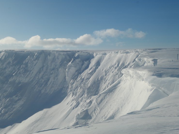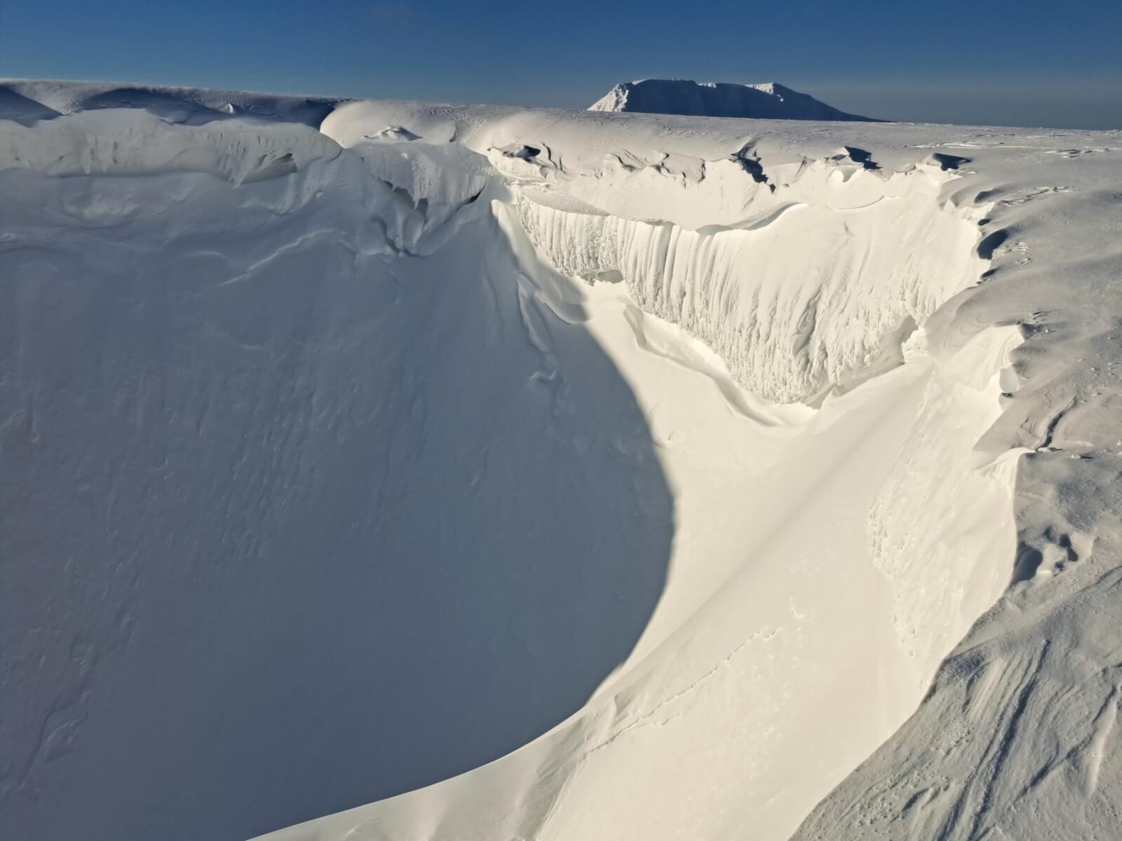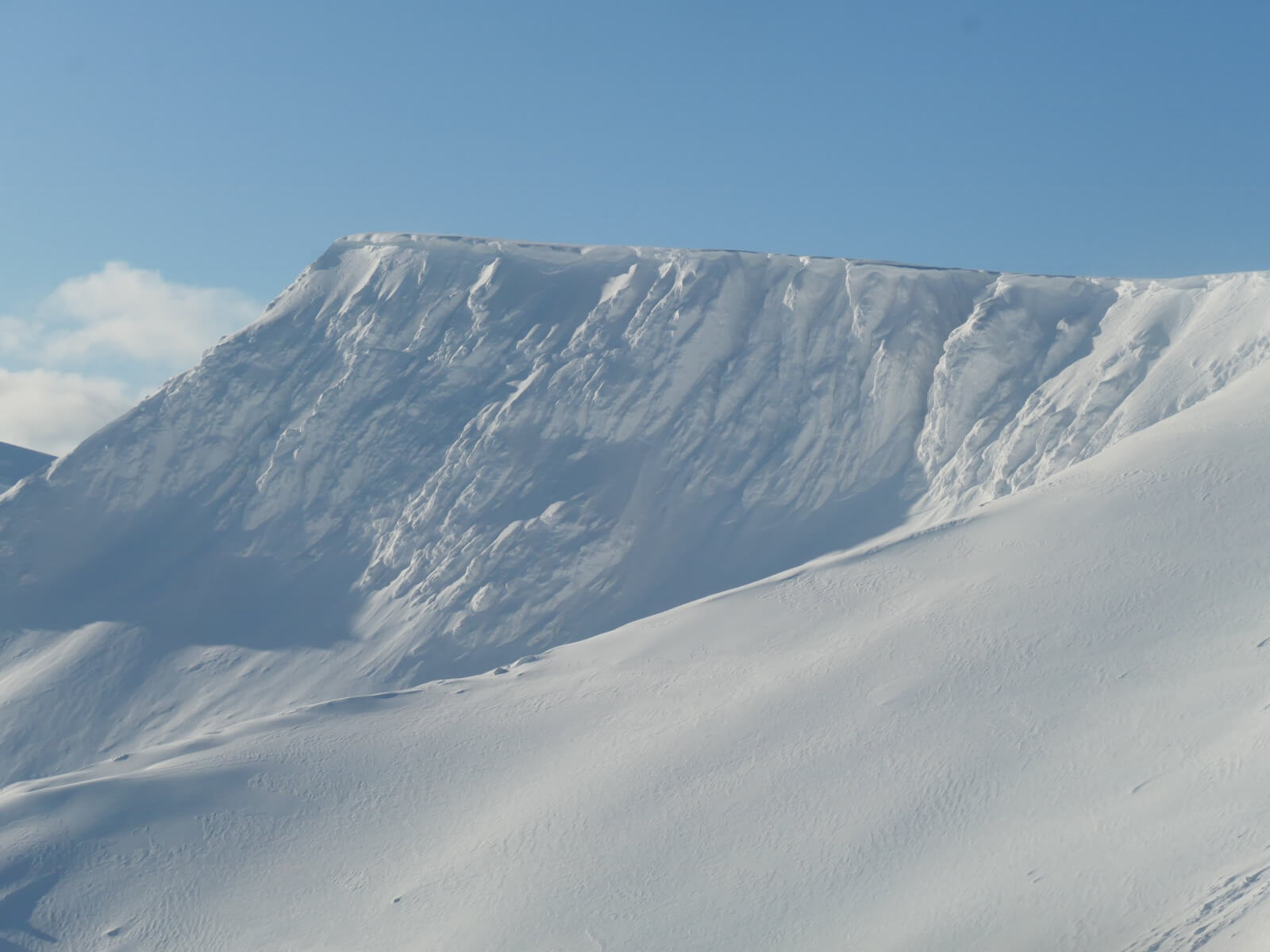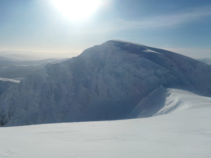 Carn Mor Dearg with Ben Nevis behind. Note the crown wall from a recent avalanche below the ridge to the right of Carn Mor Dearg.
