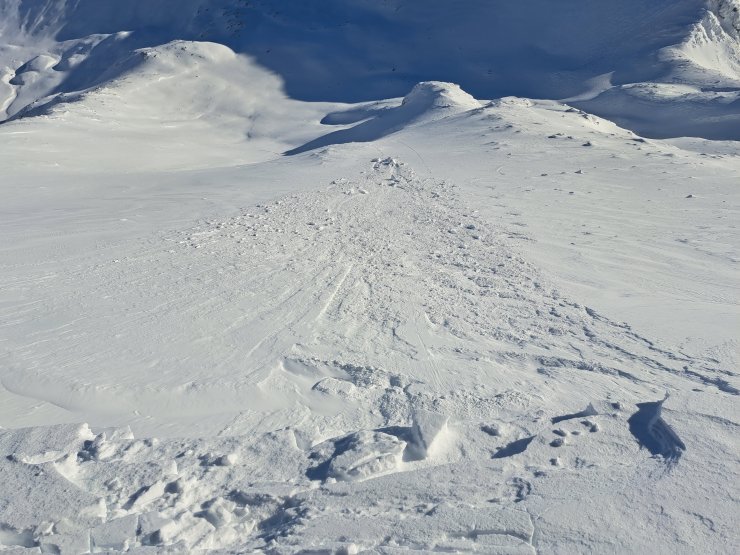 This avalanche down Spikes was triggered by a skier this morning. The cornice that they were standing on collapsed and the combined weight triggered the avalanche. They were fortunate to end up on the surface, uninjured about half way down and their tracks can be seen carrying on down.