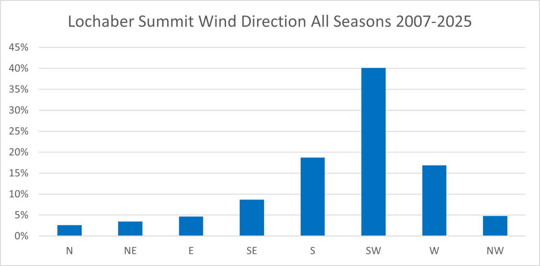 The percentage of wind directions for the season 2007/08 to 2024/25. As you would expect the most common wind direction is from the South-West with the two other most common wind directions being the South and the West. Not surprising then that the overall the most hazardous aspects tend to be North to East.