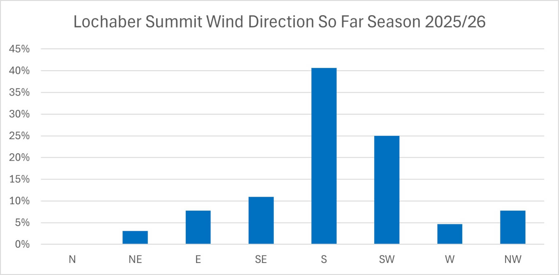 Percentage of days that the wind has been from various directions this season as measured by the Aonach Mor summit met station. According to this the most common wind direction has been from the South. Surprisingly it has been from the South-West almost double the number of days it has been from the South-East. However, I suspect that this is partly due to the location of the tower – it is actually about half way down the summit run and is slightly sheltered from East, and thus under-reads the Easterly component of the wind. However, there are few places in the mountains that the wind will not be affected by the local topography to some extent.