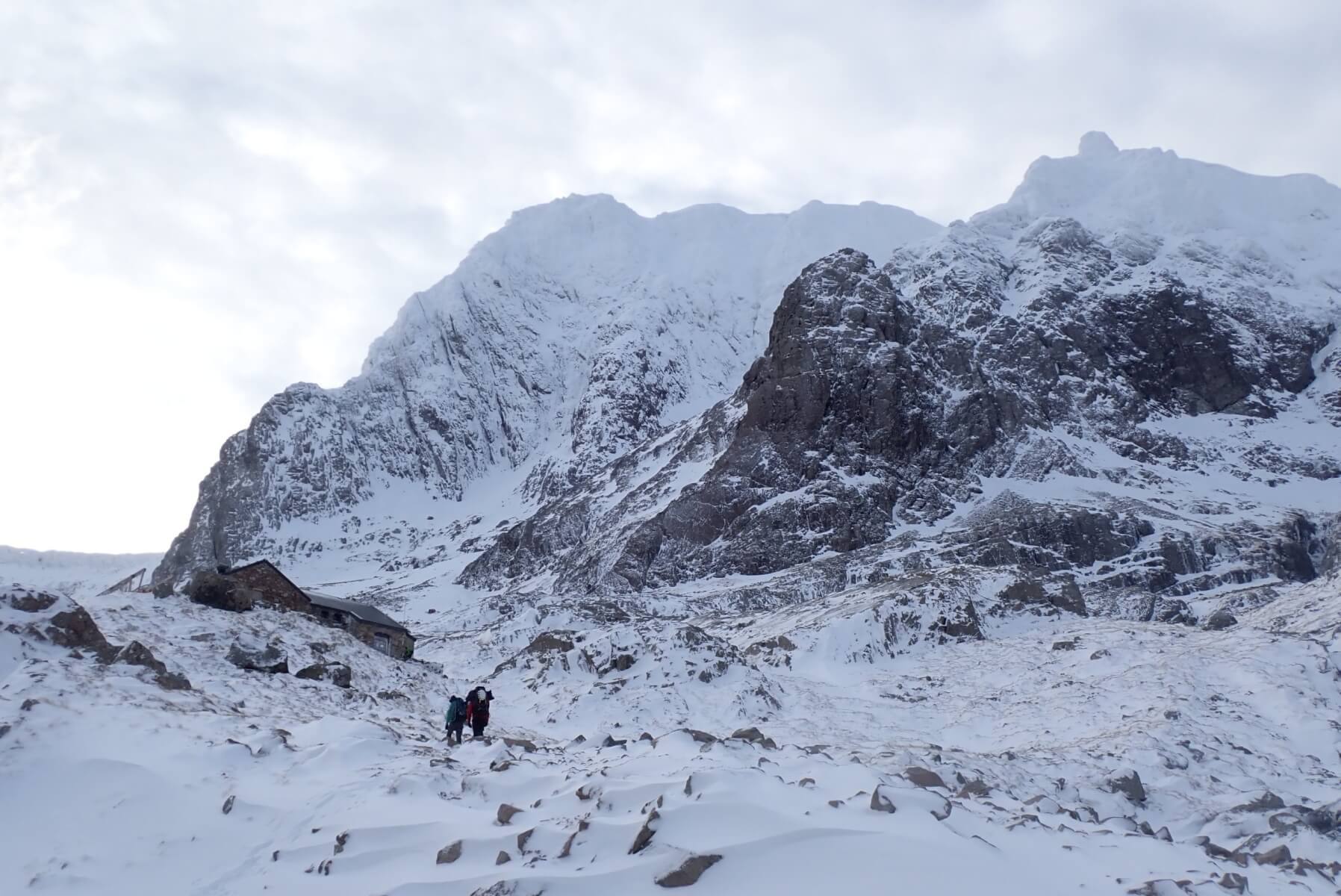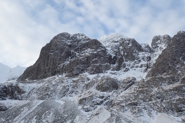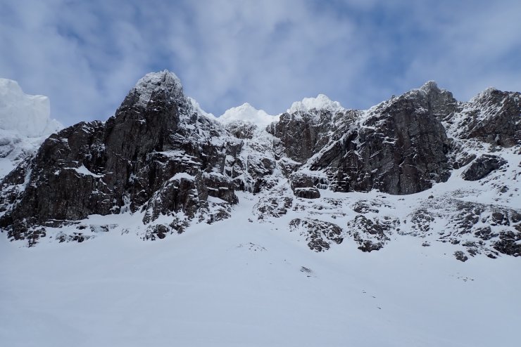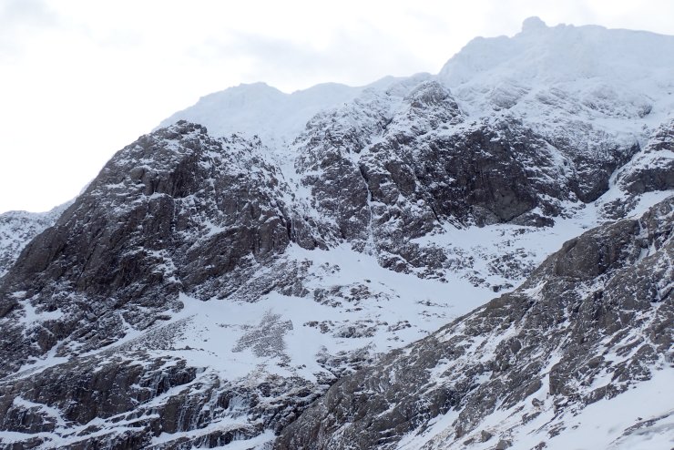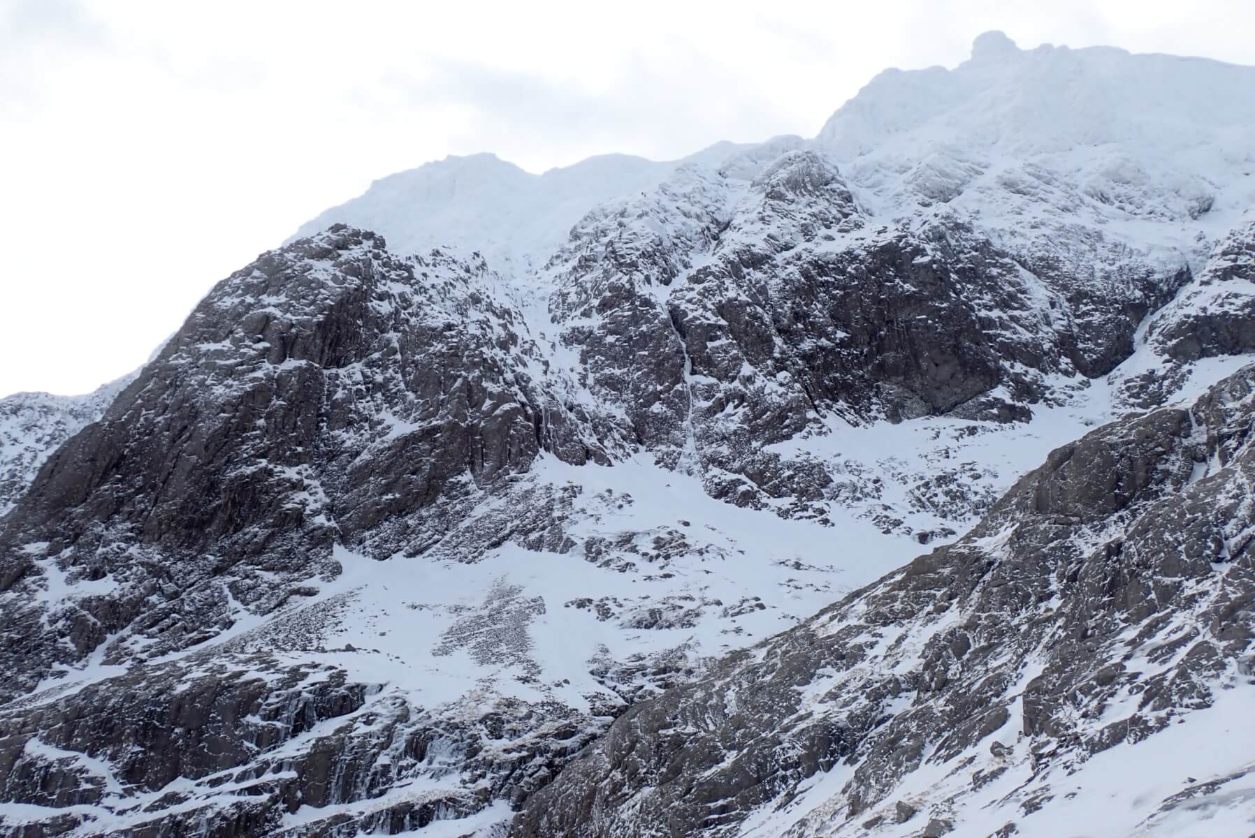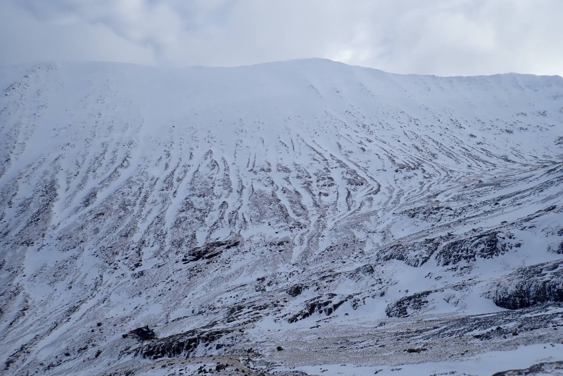 The West face of Carn Mor Dearg. The CIC hut is visible in the bottom left of the photo. The large bay near the top of the slope above the hut looked to be holding a fair bit of slab. You can just above make out the lighter shades of the windslab and the slightly greyer shades of the old hard snow-ice.