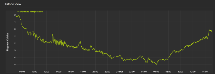 Temperatures at 1130 metres on Aonach Mor for yesterday and today. The temperature dropped to -5 degrees last night, freezing the snowpack which gradually softened as the temperature rose today.