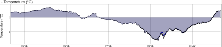 Temperatures from 1200 metres on Aonach Mor for the last 5 days. Two mild days, two cold days and a rapid rise in temperature today.