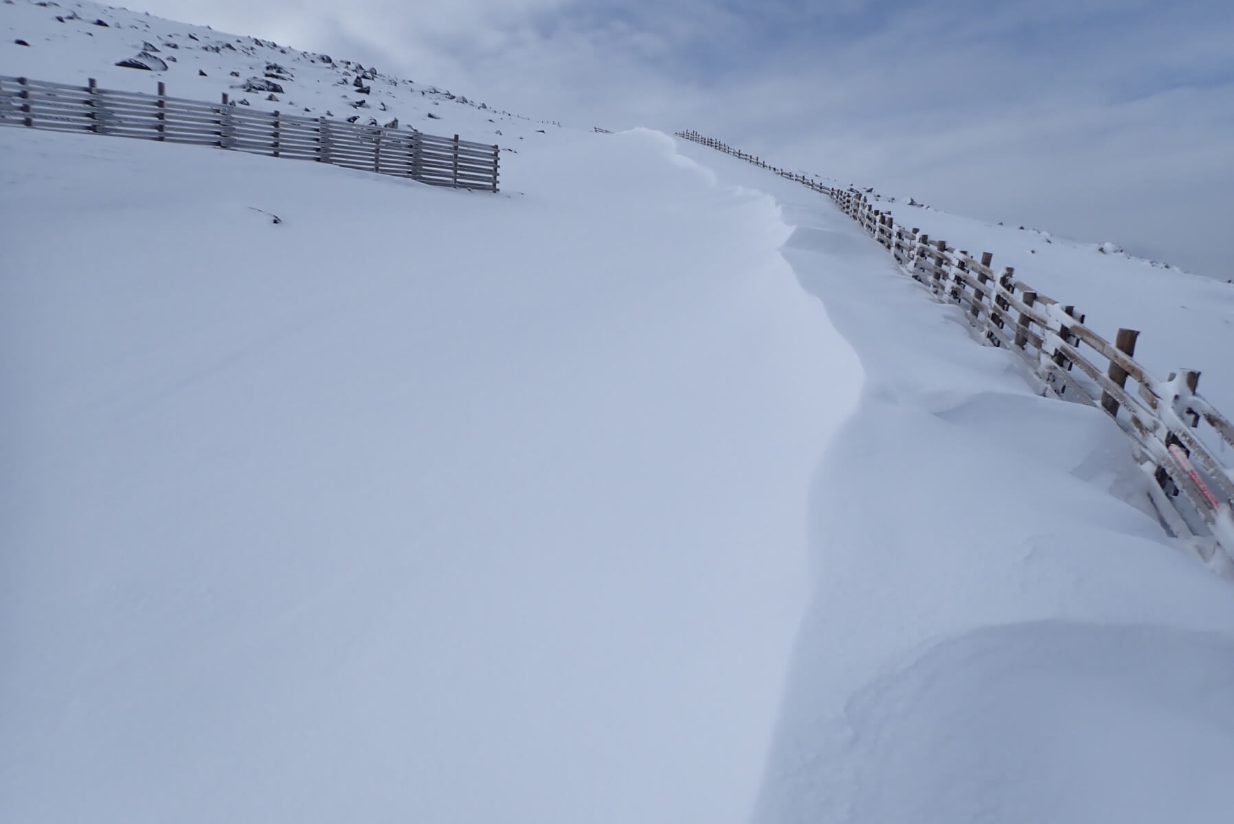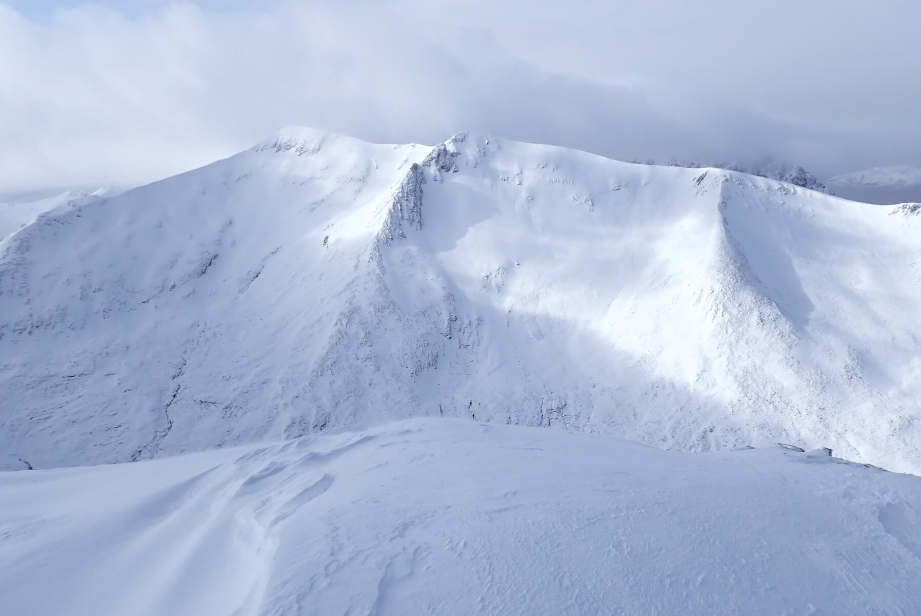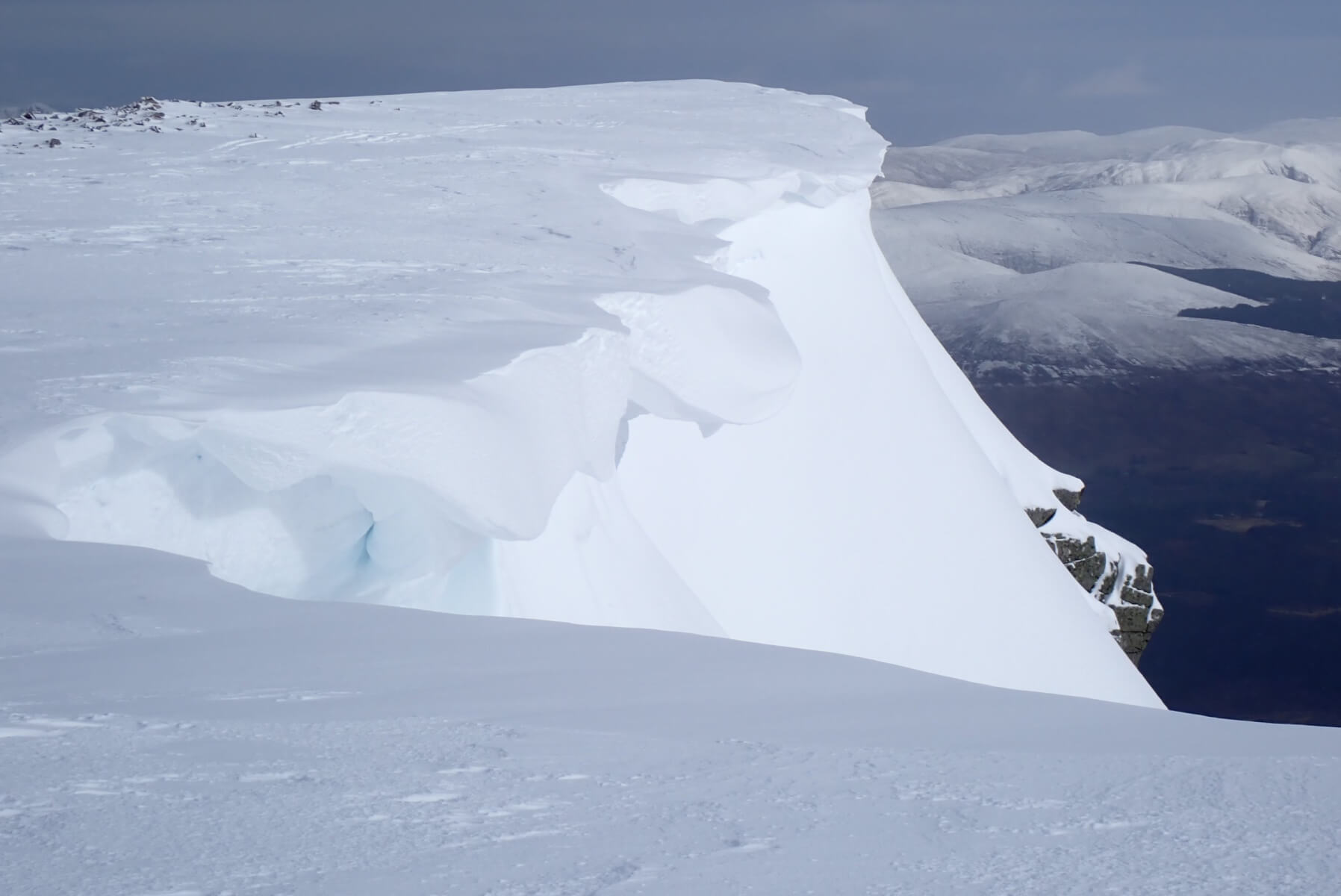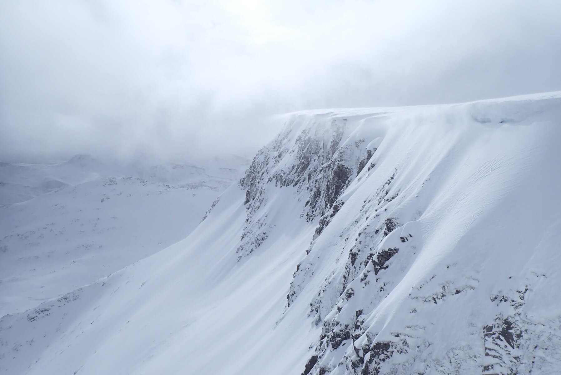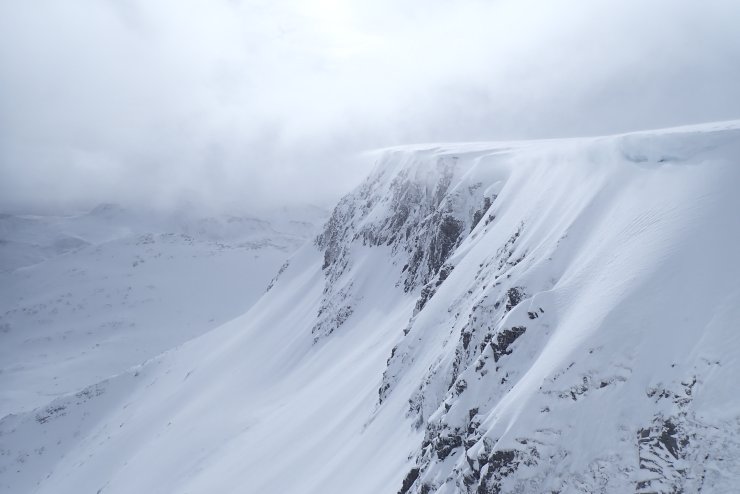 Cornices! As suspected there were some pretty substantial fresh cornices about. It was hard to get a good look into the coire as many normal viewing points are currently corniced.