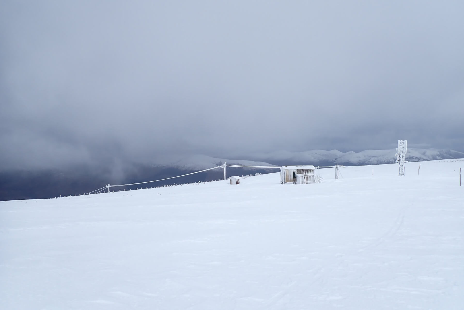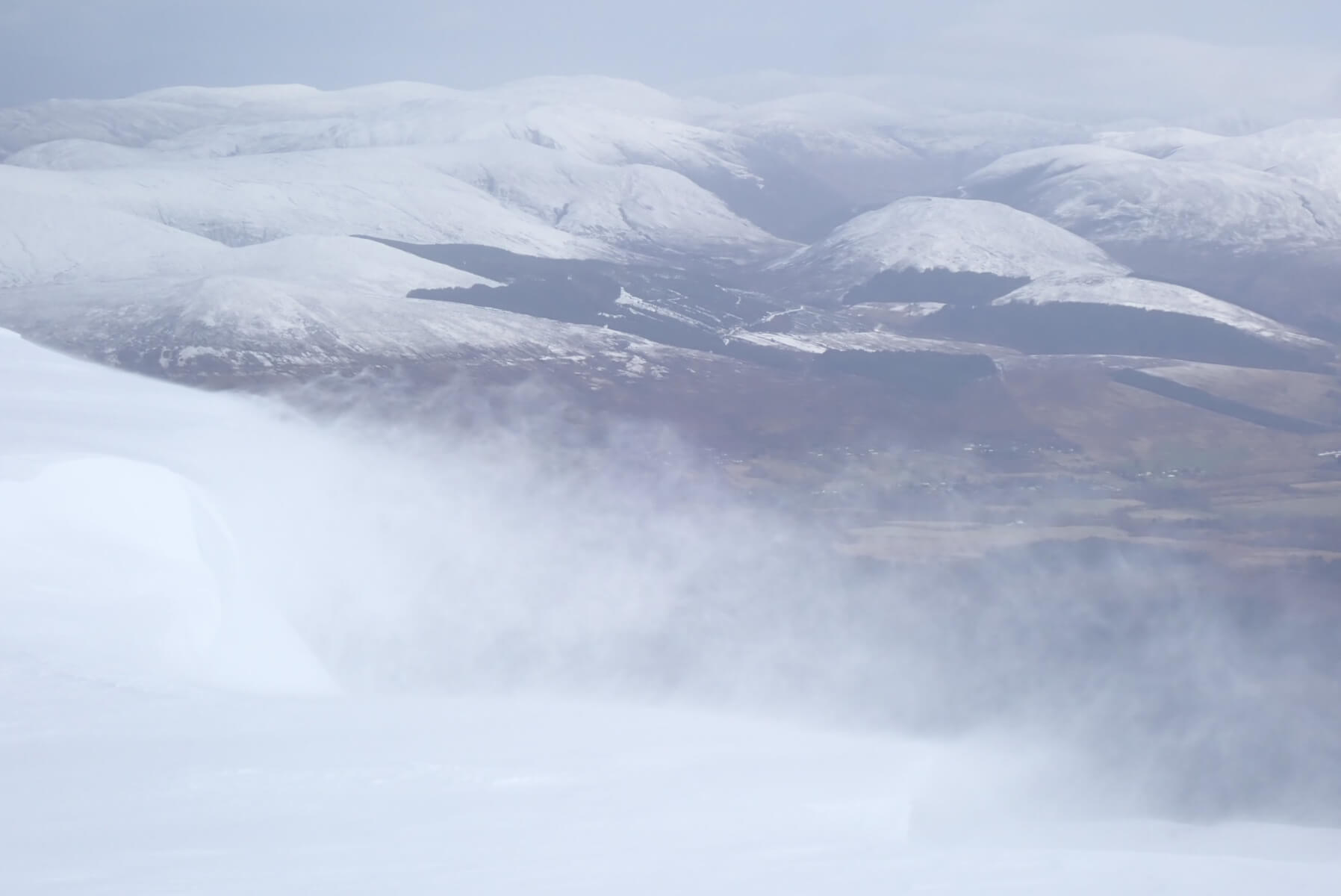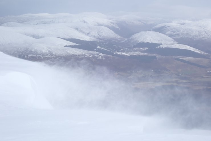 Spindrift blowing off the plateau building cornices and depositing windslab onto the scarp slopes even though it was not it was not actually snowing. The Glen Roy hills in the background.
