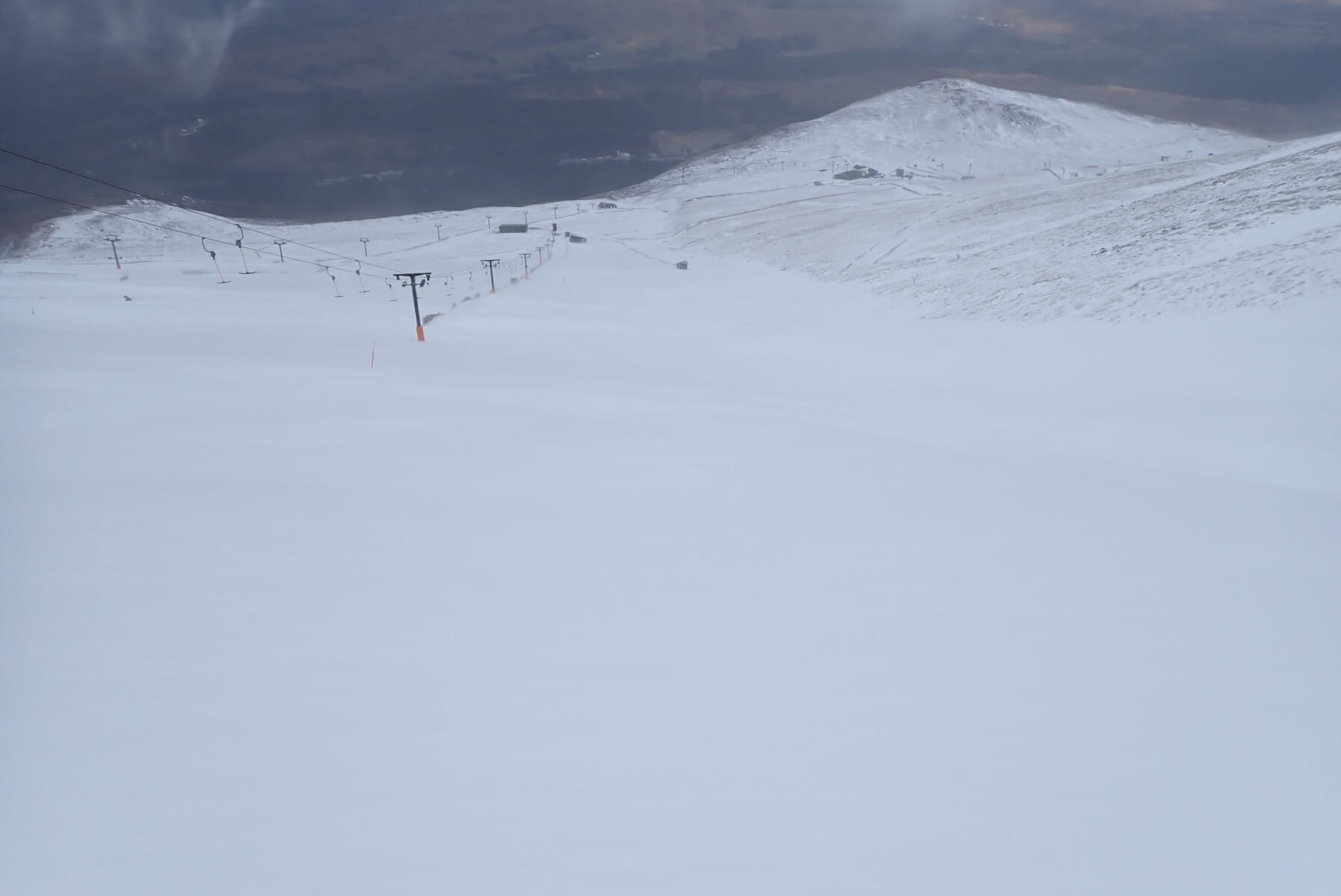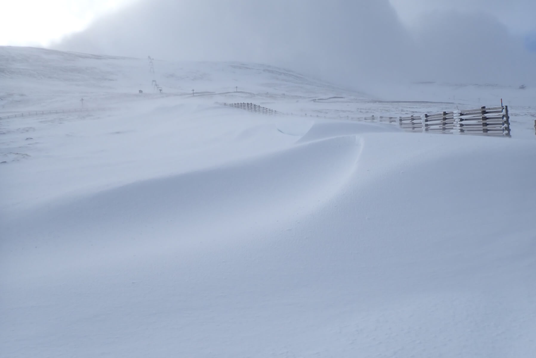 A few minutes after the previous photo was taken it had cleared up temporarily. There had been a fair bit of fresh snow and the snow fences that run up the hill such as photographed here had done a good job of catching the fresh snow.