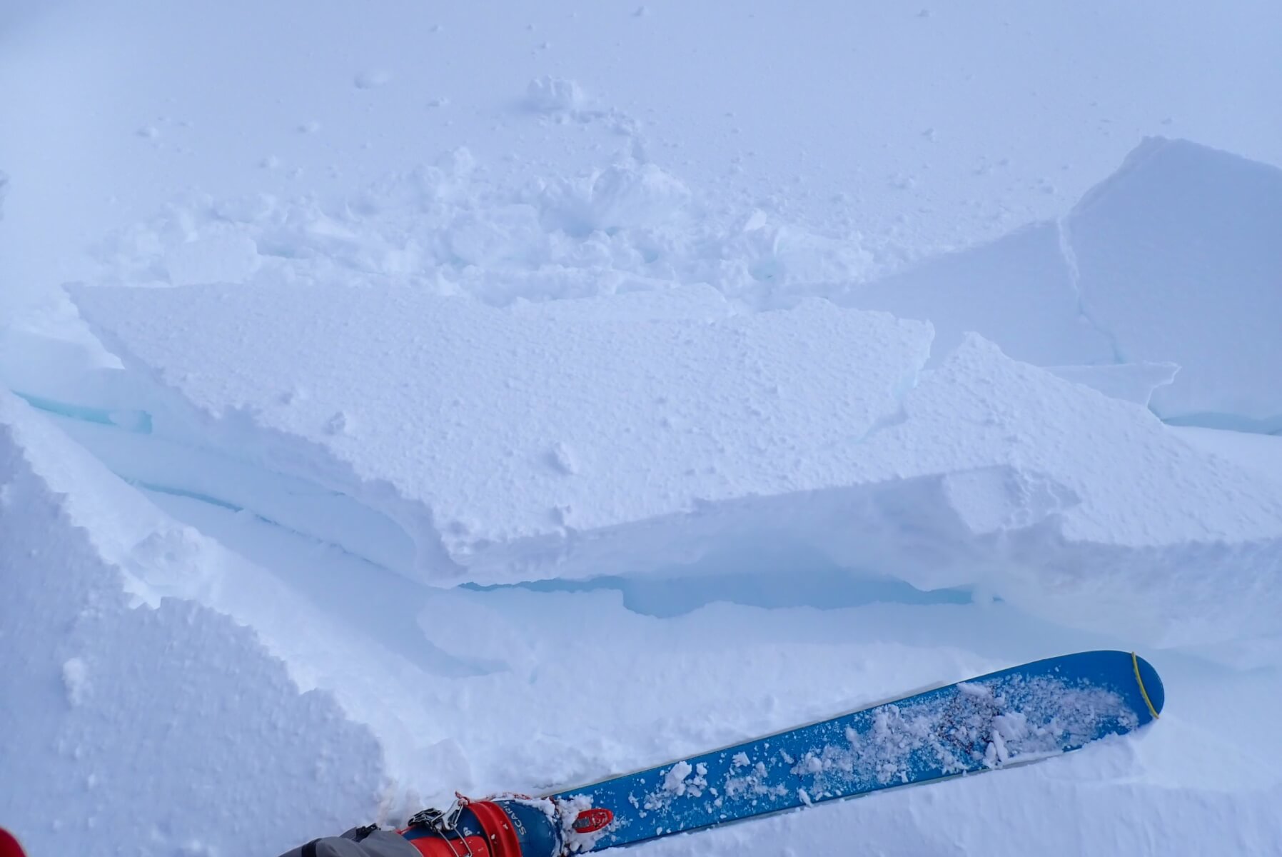 Cornice collapse below my ski. There was a few little cornice sections in the drifts that had formed behind the fences, and these proved prone to collapse when approached. There are some large cornices present in Lochaber at the moment, and I suspect like this one they would be prone to collapse.