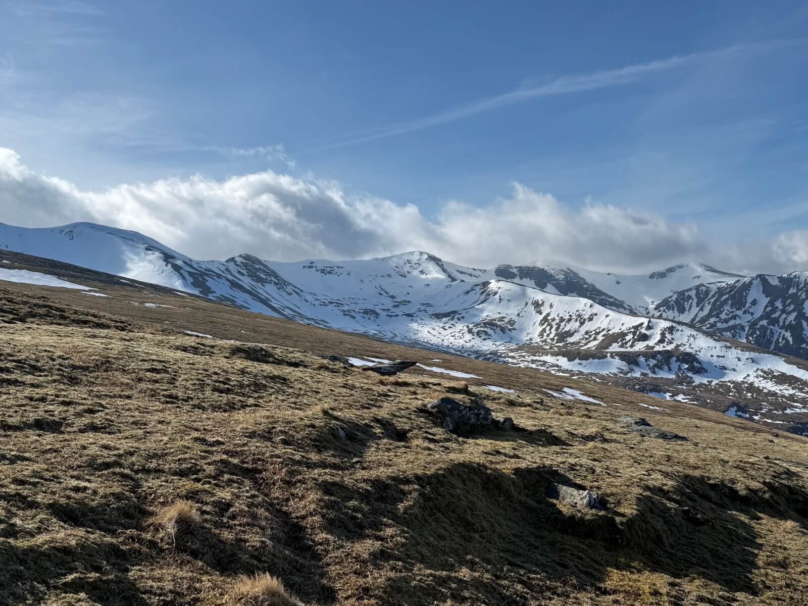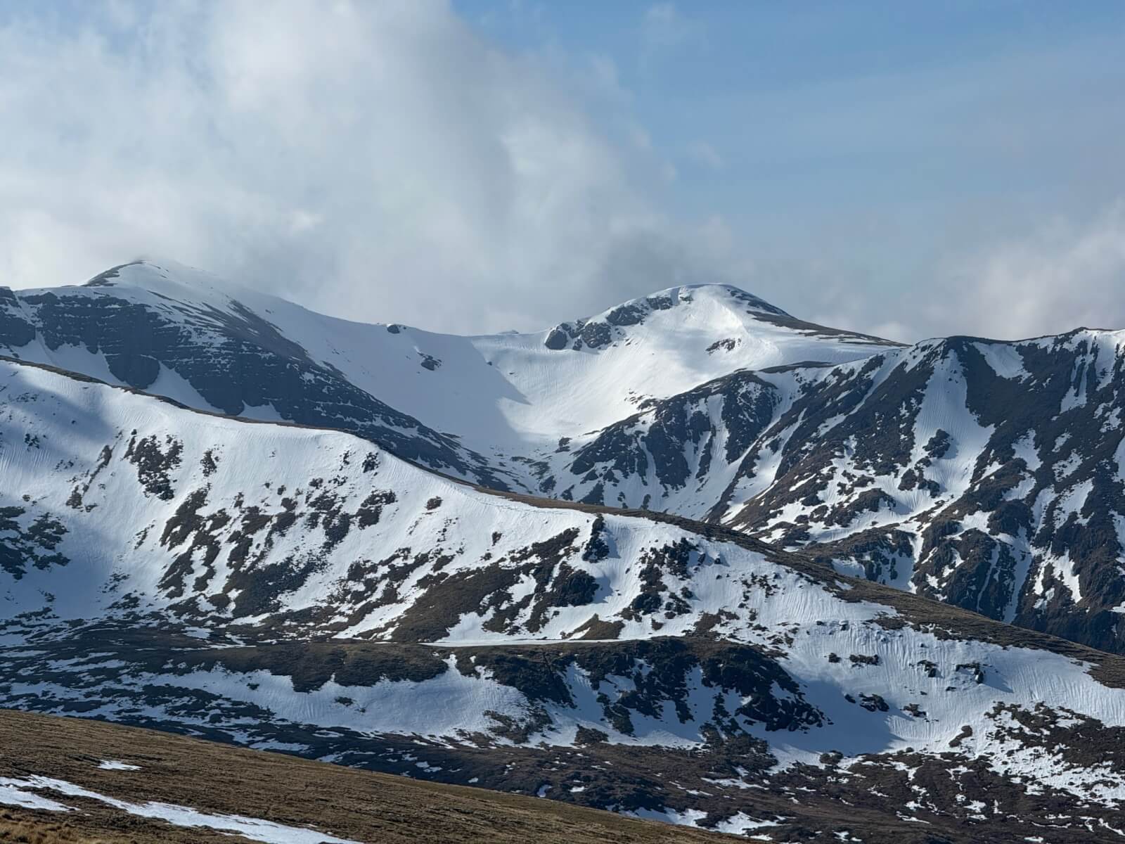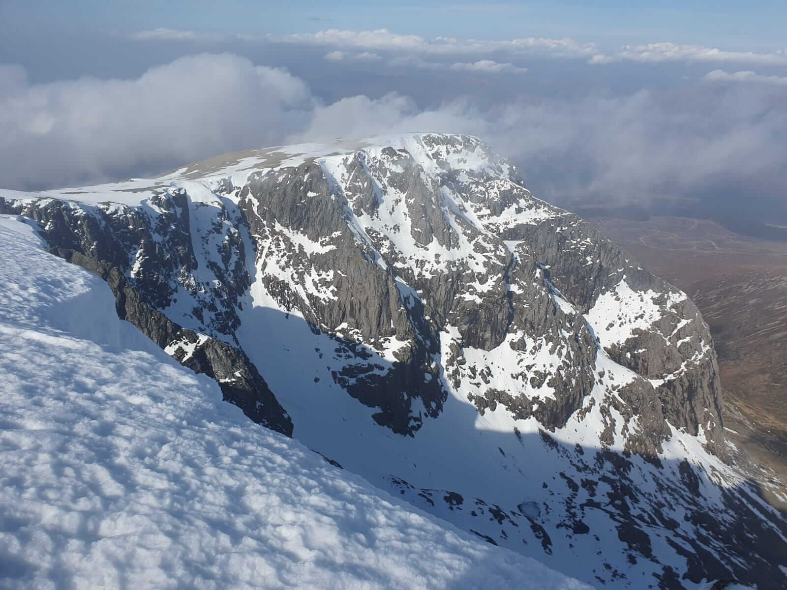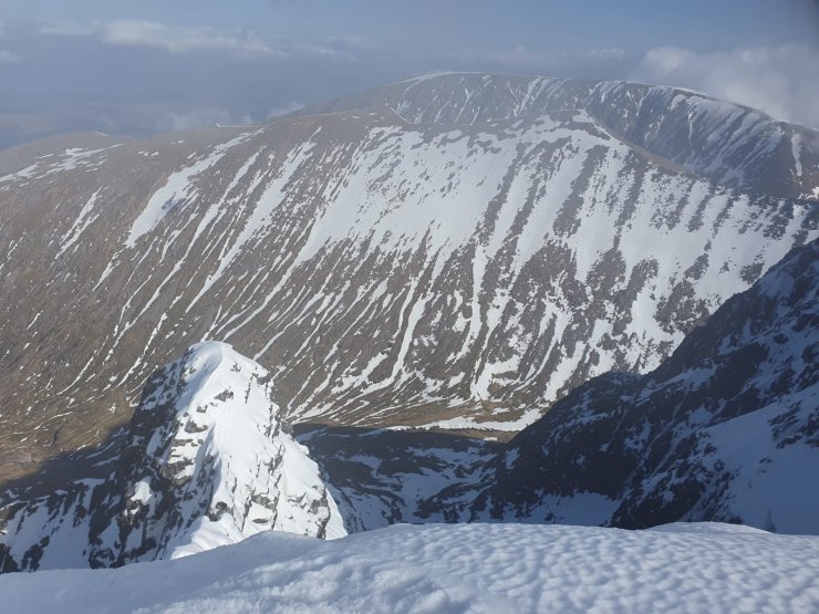 Looking across the top of Coire na Ciste Ben Nevis to Carn Dearg. Carn Dearg Buttress and ledge Route form the right hand skyline.
