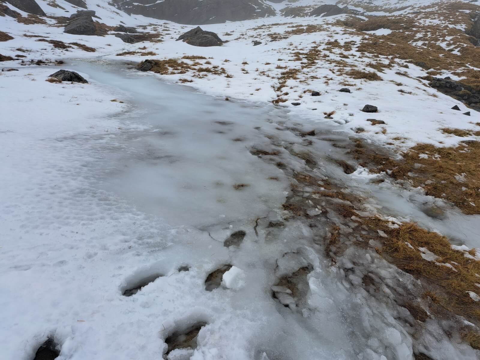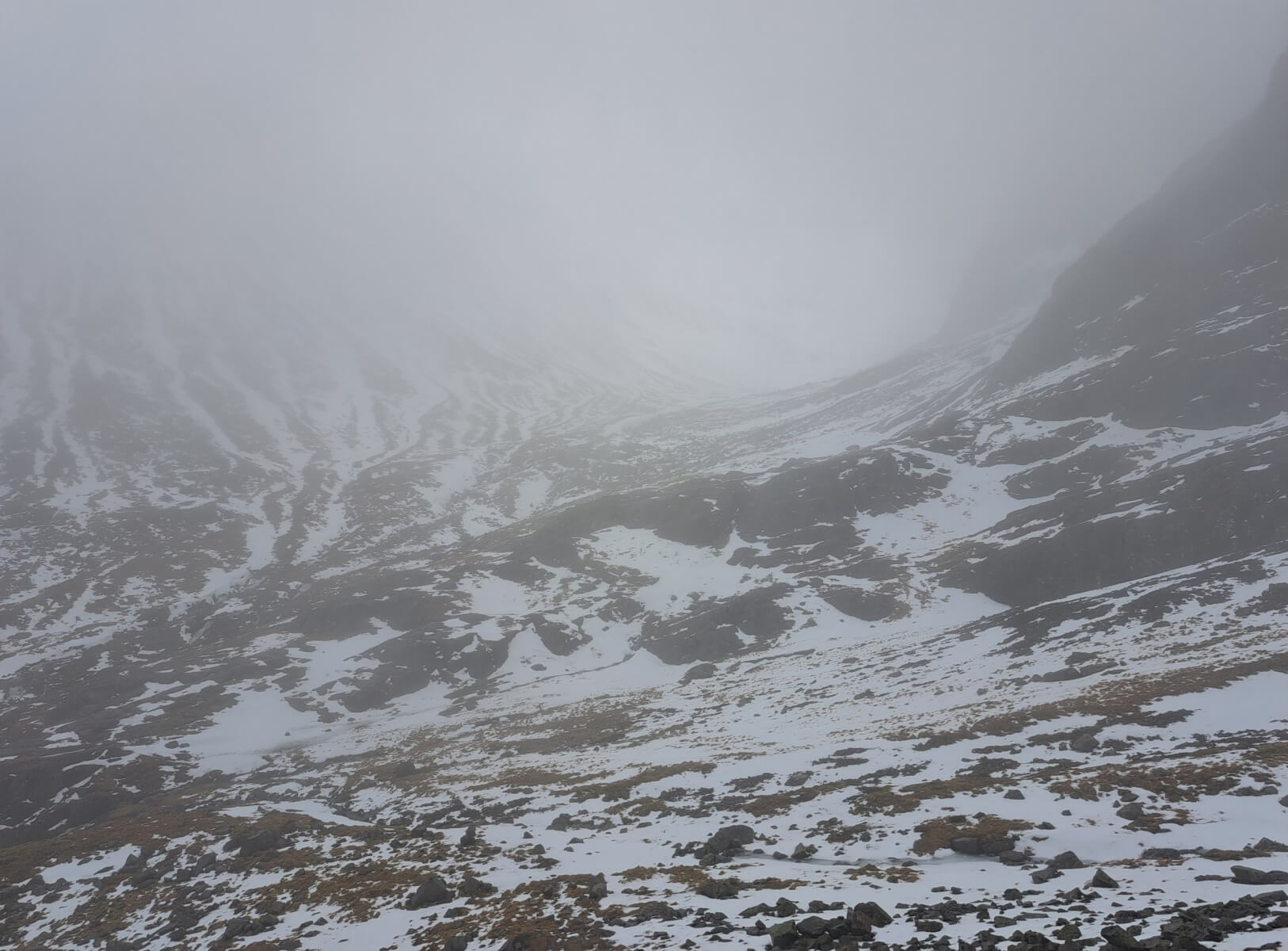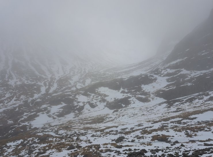 The lochan in Coire na Ciste can just be picked out. Still a widespread snow cover at 900 metres here.